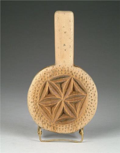CARVED WOOD LOLLIPOP BUTTER PRINT. One sided with nicely carved side pointed star with connecting outer border. Triangular chipped decoration to outside. SIZE: 4-3/4in. dia x 8in. l. CONDITION: Very good. 9-25358
