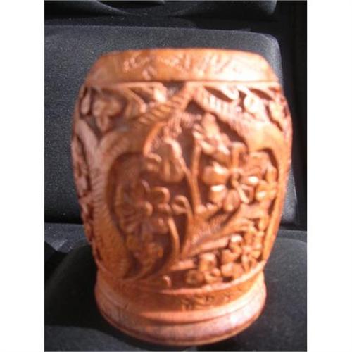 THIS INTRICATELY HARD CARVED HARD WOOD STAINED PAINT BRUSH HOLDER IS 4" (10CM) X 3" (8CM). IT IS IN GOOD CONDITION. IT IS MARKED "INDIA" IN BLACK INK AT THE BASE.