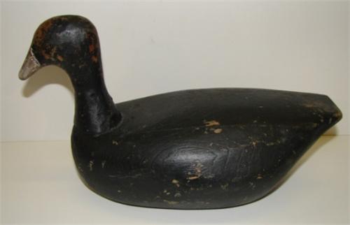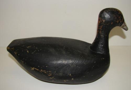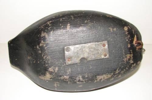CARVED WOODEN BRANT WORKING DECOY WITH ROOT HEAD. Has weight at bottom. Shows wear and loss to paint at head.