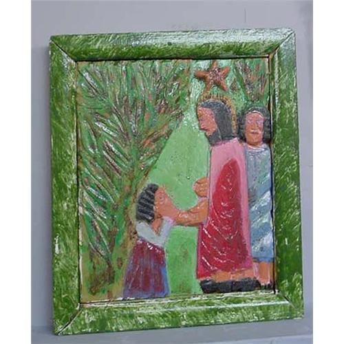CARVED WOODEN PLAQUE BY ELIJAH PIERCE. Titled "Blind Bartimaeus" and signed "2.4.81 Elijah Pierce". Three figures in low relief with glitter and polychrome paint, mostly green, blue, pink, and red. Green painted frame. 16 3/4"h. 14 1/4"w.