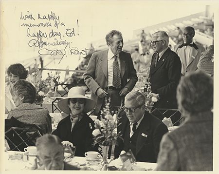 (1904 - 1986) English actor who often played the suave gentleman in light comedies. Fine vintage I.S.P. 10" x 8" b/w, shows Grant ca. 1970s at a luncheon talking with another gentleman. Inscribed at top left: "with happy memories of a happy day, Ed! Appreciatively, Cary Grant". Light wear to edges, otherwise very good.