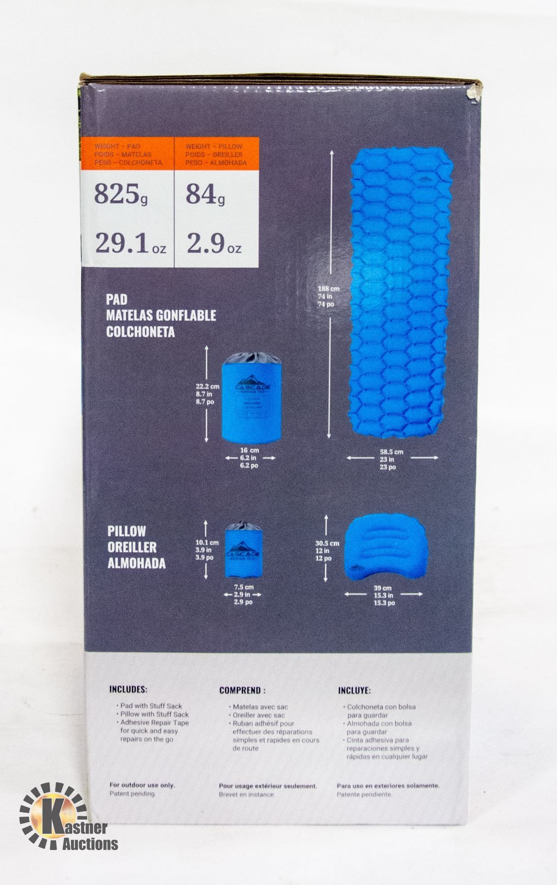 INCLUDES: PAD, PILLOW, STUFF SACK FOR EACH. 3-SEASON INSULATED SLEEPING PAD: SPRING, SUMMER AND FALL QUICK INFLATION AND DEFLATION VALVE, LIGHT AND PACKABLE. DIMENSIONS: 74" L X 23" W X 3" H / 188 CM X 58.5 CM X 7.7 CM **ALL ITEMS MUST BE REMOVED BY 5PM SATURDAY, AUGUST 19TH 2023. ALL REMAINING ITEMS WILL BE SUBJECT TO A $6.00 PER DAY STORAGE CHARGE. ANY ITEMS REMAINING AFTER MONDAY, SEPTEMBER 4TH, 2023 WILL BE CONSIDERED FORFEITED. NO REFUNDS WILL BE ISSUED FOR FORFEITED ITEMS. TO SCHEDULE A PICK UP APPOINTMENT CLICK HERE
