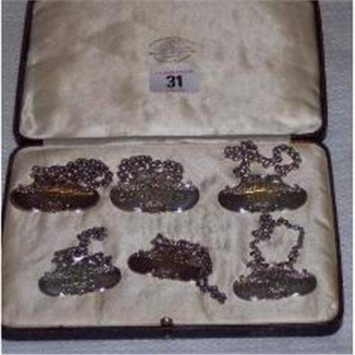 CASE CONTANING 6 GEORGIAN GLASGOW SILVER DECANTER LABELS WHISKY, SHERRY, BRANDY, PORT, MADIERA, HOLLANDS DATED 1827 - 1829