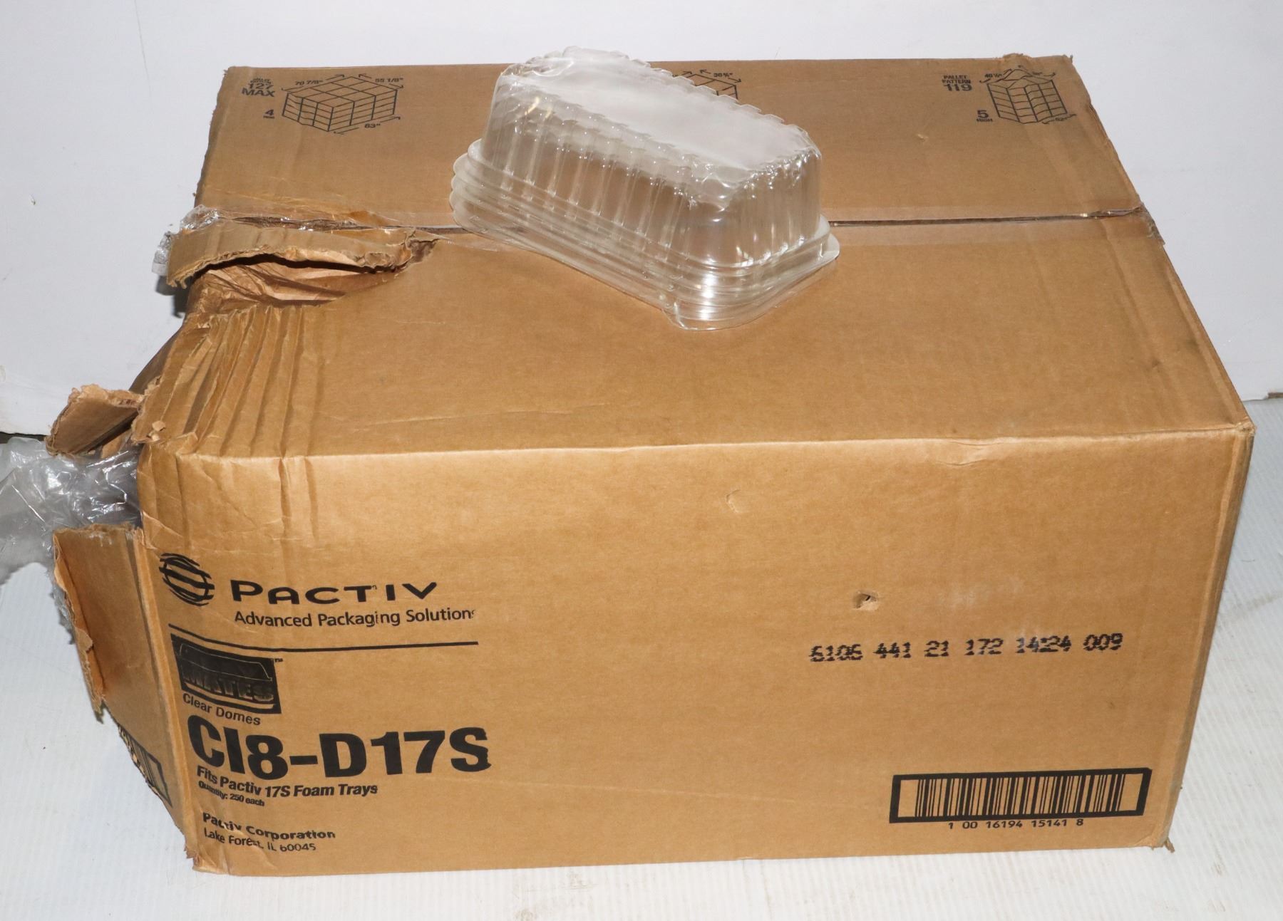 FITS PACTIV 17S FOAM TRAYS. CASE ORIGINALLY 250, CORNER OF CASE DAMAGED, SOME DOMES ARE DAMAGED