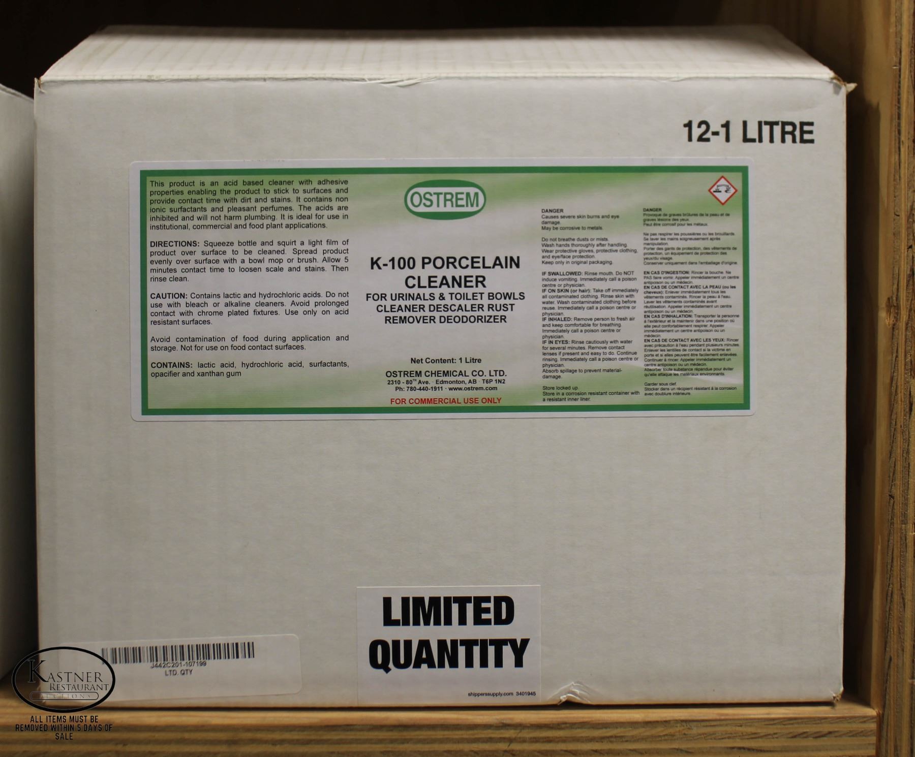 PORCELAIN CLEANER FOR URINALS & TOILET BOWLS, DESCALING, RUST REMOVAL, & DEODOURIZING. K-100**ALL ITEMS MUST BE REMOVED BY 5PM MONDAY, OCTOBER 2ND, 2023. ALL REMAINING ITEMS WILL BE SUBJECT TO A $6.00 PER DAY STORAGE CHARGE. ANY ITEMS REMAINING AFTER MONDAY, OCTOBER 16TH, 2023 WILL BE CONSIDERED FORFEITED. NO REFUNDS WILL BE ISSUED FOR FORFEITED ITEMS.** TO SCHEDULE A PICK UP APPOINTMENT CLICK HERE