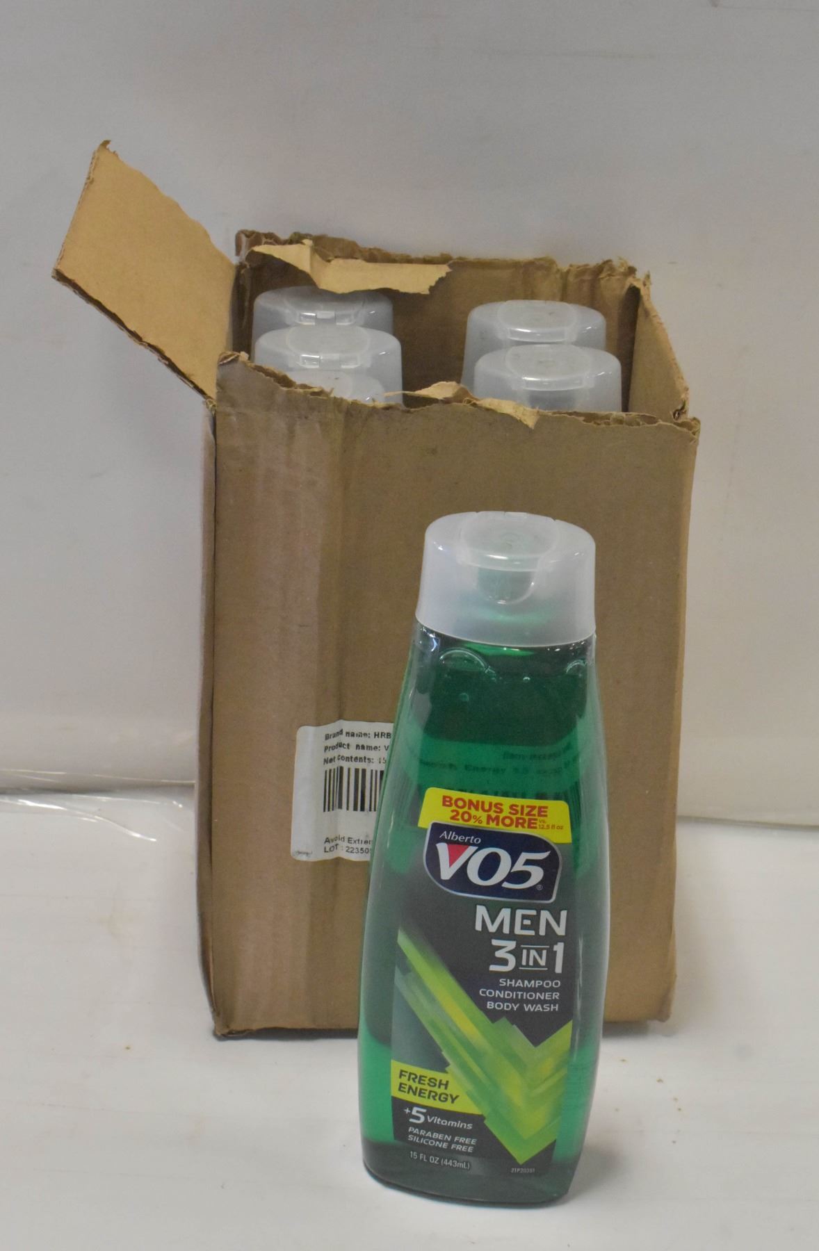 CASE WITH 6 BOTTLES OF VO5 MENS 3 IN 1 SHAMPOO