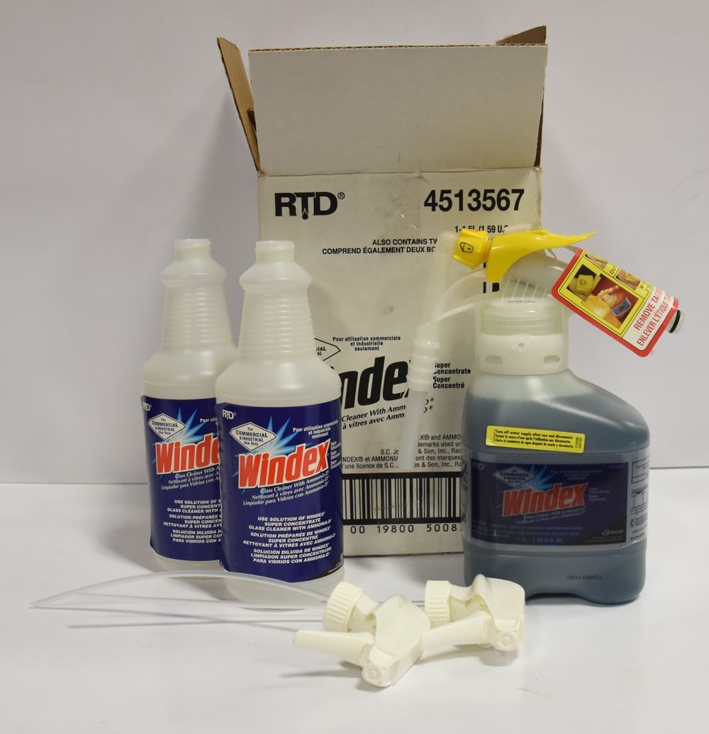 CASE WITH COMMERCIAL WINDEX AND SPRAY BOTTLE.