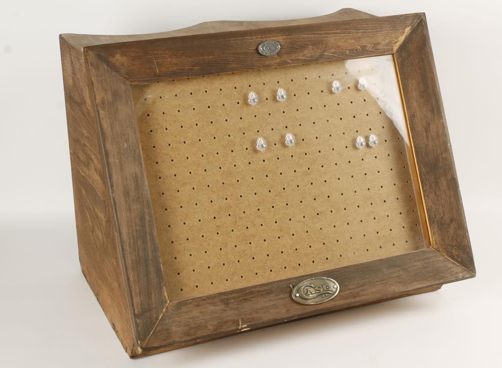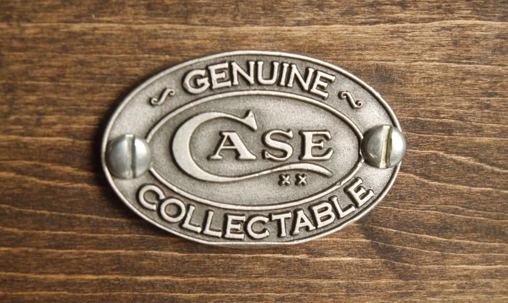 Front glass drop down frame for display of knives, Case emblem displayed twice on frame, 6 small and 3 large sliding drawers on the back side for storage, measures 19"Hx23 1/2"Wx18 1/2" at deepest point.