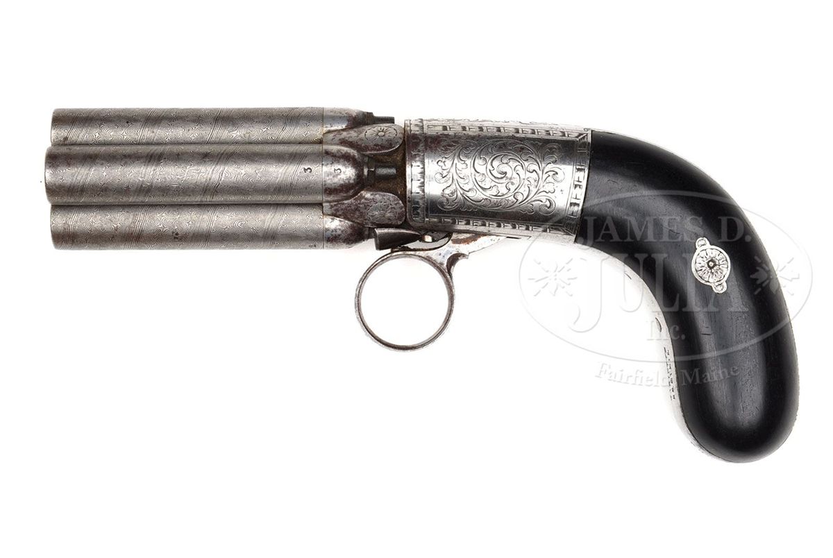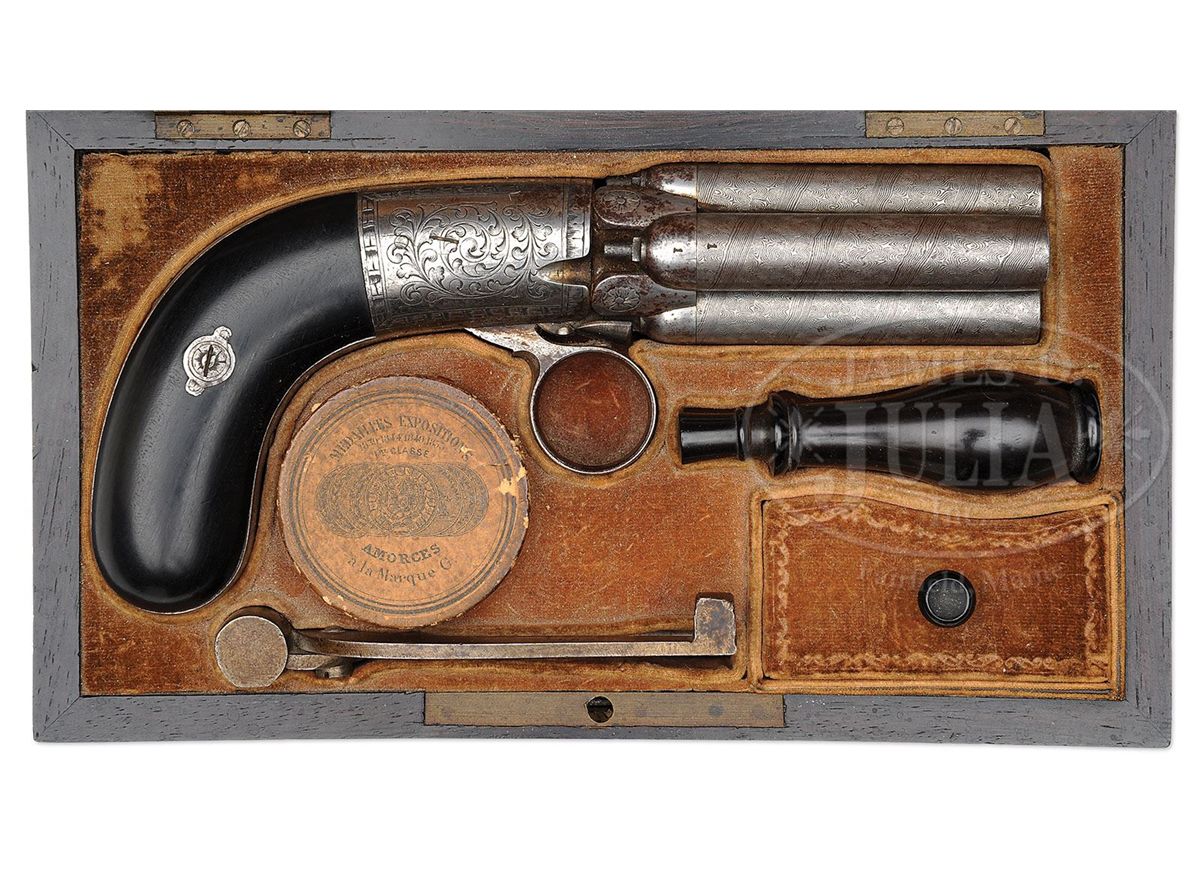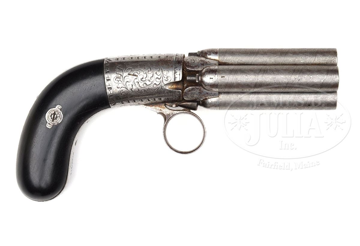 SN 662. Cal. 38. Fine Belgian pepper box with 2-1/4" fine Damascus 4-bbl cluster that are screw bbls all matching numbered to the rotating wheel. It has rnd frame with 2-pc smooth ebony bag-shaped grips and a ring trigger. Frame & backstrap are engraved in foliate arabesque patterns. Accompanied by its orig burgundy, velvet lined mahogany casing with empty plaque in the lid. Compartmented in the bottom for the pistol, a single cavity nutcracker ball mold with sprue cutter. One arm has a bbl wrench and the other a nipple wrench. Mold is matching numbered to the pistol. Also contains a small ebony oil bottle with screw cap and a rnd hole for cap tin which is covered by a paper cap box cover. Right front covered compartment contains lead balls. Cased pepper boxes are quite scarce. CONDITION: Pistol retains about all of its orig Damascus pattern on the bbls with scattered patina on the bbl rotating wheel. Frame & backstrap retain most of their orig bright polish. Grips are sound and retain about all of their orig polish. Mechanics are fine. Strong bright bores. Case has a crack in the lid and a couple of small grain checks, otherwise is sound and retains most of its orig varnish. Interior is heavily faded to a gold color with light to moderate soil. Mold is fine. Oil bottle is very fine. Paper cap box cover is soiled and yellowed. 4-48628 JR418