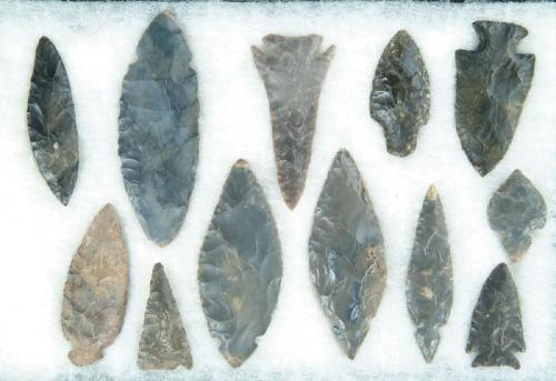 CASED ASSORTED POINTS. Approximately 12 points. CONDITION: Generally very good, one is broken and one or two with some dings. 9-25984-134 The Tennessee Collection of Prehistoric Indian Artifacts from the Allen Graves Estate. SPECIAL NOTE: We do not regularly sell Prehistoric Indian stone artifacts and therefore have very little experience and no expertise in this area. All of the following lots have come from the Collection of the Late Allen Graves of Tennessee. The collection was inherited some years back by his daughter, who now lives in Maine. This collection was consigned to us directly from her. We employed someone to generally identify styles and types, but as stated above, due to our lack of expertise in this field, we can not guarantee the age or origin of the following pieces. We are relying on you, the buyer, to determine to your satisfaction the origin and age of each item in the collection.