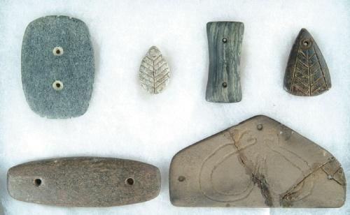 CASED ASSORTMENT OF SIX PENDANTS AND GORGETS. Various age and materials. Two holed banded slate gorget and two-holed gorget of schist. These two appear to be Woodland type period artifact and the other four are of questionable age. CONDITION: Very good. 9-25984-143 The Tennessee Collection of Prehistoric Indian Artifacts from the Allen Graves Estate. SPECIAL NOTE: We do not regularly sell Prehistoric Indian stone artifacts and therefore have very little experience and no expertise in this area. All of the following lots have come from the Collection of the Late Allen Graves of Tennessee. The collection was inherited some years back by his daughter, who now lives in Maine. This collection was consigned to us directly from her. We employed someone to generally identify styles and types, but as stated above, due to our lack of expertise in this field, we can not guarantee the age or origin of the following pieces. We are relying on you, the buyer, to determine to your satisfaction the origin and age of each item in the collection.