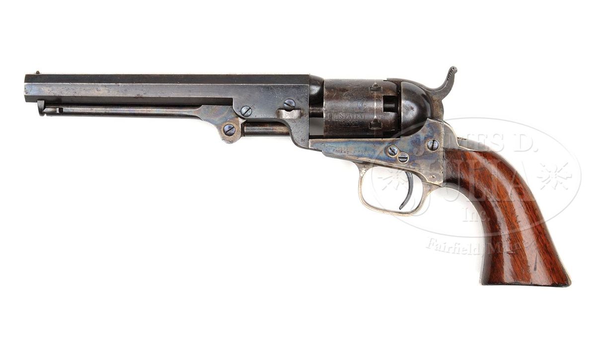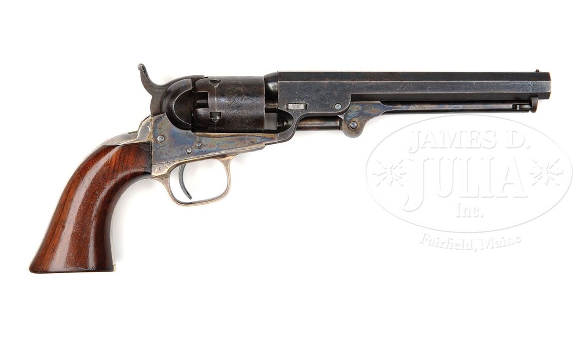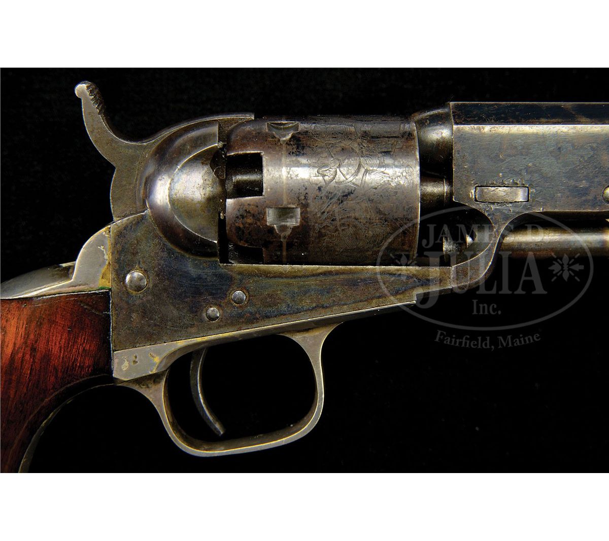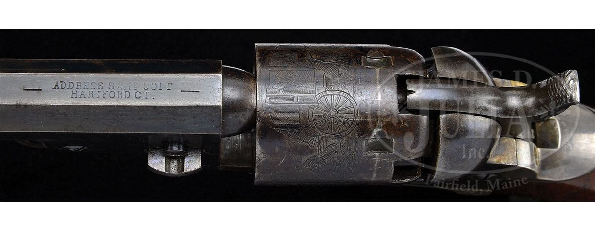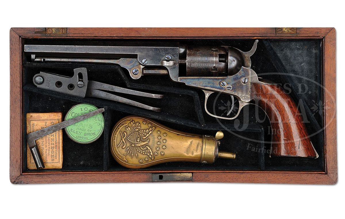 SN 180748. Cal. 31. Blue & color case hardened with desirable 6" oct bbl, brass pin front sight and scarce 2-line Hartford address. Left side of frame is marked with a small "COLTS PATENT" and it has 5-shot cylinder with stagecoach holdup scene roll marking. The large guard silver plated brass trigger guard & backstrap contain a varnished 1-pc walnut grip with last four digits of matching SN in backstrap channel. Accompanied by a dark green velvet lined mahogany casing partitioned in the bottom for the revolver, a blued 2-cavity "COLT'S PATENT" mold with sprue cutter marked on right side "31 PKT", a sgl sided brass eagle & stars flask, an L-shaped nipple wrench, a packet of six combustible cartridges and a cap tin with reproduction label. Right rear compartment contains cast lead bullets & balls. This revolver was produced in 1860 just prior to the outbreak of the Civil War and almost certainly would have seen service during the Civil War and later, probably on the American Frontier. These small revolvers were extremely popular from their first production until well into the 1870s when they were supplanted by the advent of the self-contained cartridge revolver. They saw extensive use by frontier people of all walks of life and are rarely found today with high orig finish and almost never with an orig case. CONDITION: Very fine plus, all matching including wedge & grip. Bbl retains 80-85% strong orig blue with some fading about the center; rammer pivot & handle retain brilliant case colors; frame retains brilliant case colors on the sides, turned dark on recoil shields; hammer retains about all of its dark orig case colors; cylinder retains about 30-40% orig blue with the balance flaked to a dark patina and shows 95-97% stagecoach holdup scene; trigger guard & backstrap retain most of their strong orig silver plate with only a few small nicks on the front strap and slight wear on the heel. Grip is missing a sliver from the left heel, otherwise is sound showing light to moderate wear with a few light nicks and retains most of its orig varnish. Mechanics are crisp, very bright shiny bore with two or three small spots of pitting. Case is sound with a few light handling & storage nicks & scratches and retains cleaned orig varnish; interior is very lightly faded inside the lid and moderately faded on the bottom with one partially loose partition and some light staining; mold retains about 80% restored blue; flask has 4 or 5 small dents with solder over the collar screws and retains a dull brass patina; nipple wrench is fine; cartridge packet is still sealed; reproduction cap tin is fine. 4-49245 JR382