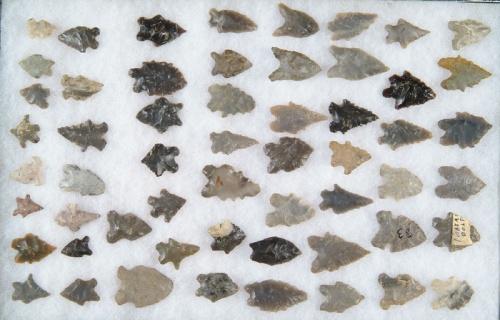 CASED EARLY ARCHAIC TYPE BIFURCATE SPEAR POINTS. Early Archaic, Circa 9000BC style-6000BC style. Mostly Knox flint from Tennessee. Approximately 56 points. CONDITION: Generally very good. 9-25984-142 The Tennessee Collection of Prehistoric Indian Artifacts from the Allen Graves Estate. SPECIAL NOTE: We do not regularly sell Prehistoric Indian stone artifacts and therefore have very little experience and no expertise in this area. All of the following lots have come from the Collection of the Late Allen Graves of Tennessee. The collection was inherited some years back by his daughter, who now lives in Maine. This collection was consigned to us directly from her. We employed someone to generally identify styles and types, but as stated above, due to our lack of expertise in this field, we can not guarantee the age or origin of the following pieces. We are relying on you, the buyer, to determine to your satisfaction the origin and age of each item in the collection.