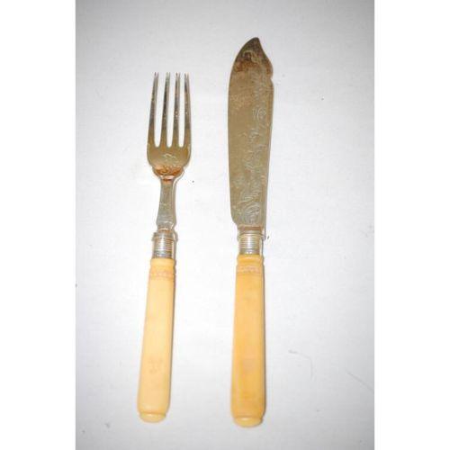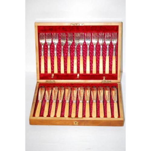 CASED ENGLISH FISH SET W/ IVORY HANDLE & STERLING FERRULES-19TH CENT. SERVICE FOR 12 W/ PLATED BLADES W/ BRIGHT CUT DESIGNS, SHEFFIELD PLATE W/ TC JWC MAKERS MARKS IN FITTED INLAID CASE W/ BRASS - WEAR & MINOR IMPERFECTIONS