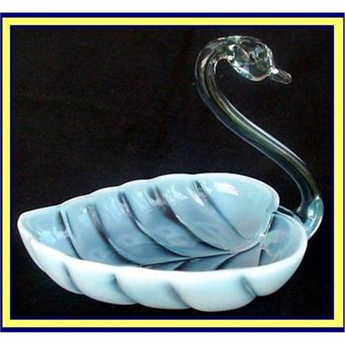Cased glass bowl in the form of a swan, the body in the form of a rounded leaf. Dates to mid 20th century.<BR>Measures 6 1/4inches high. Width a little over 7 3/4inches.<BR>Clear handblown glass forms the graceful neck and head.<BR>The body in the form of a rounded leaf, the veins revealing the clear glass and the rest a blueish-white.<BR>Mint condition.