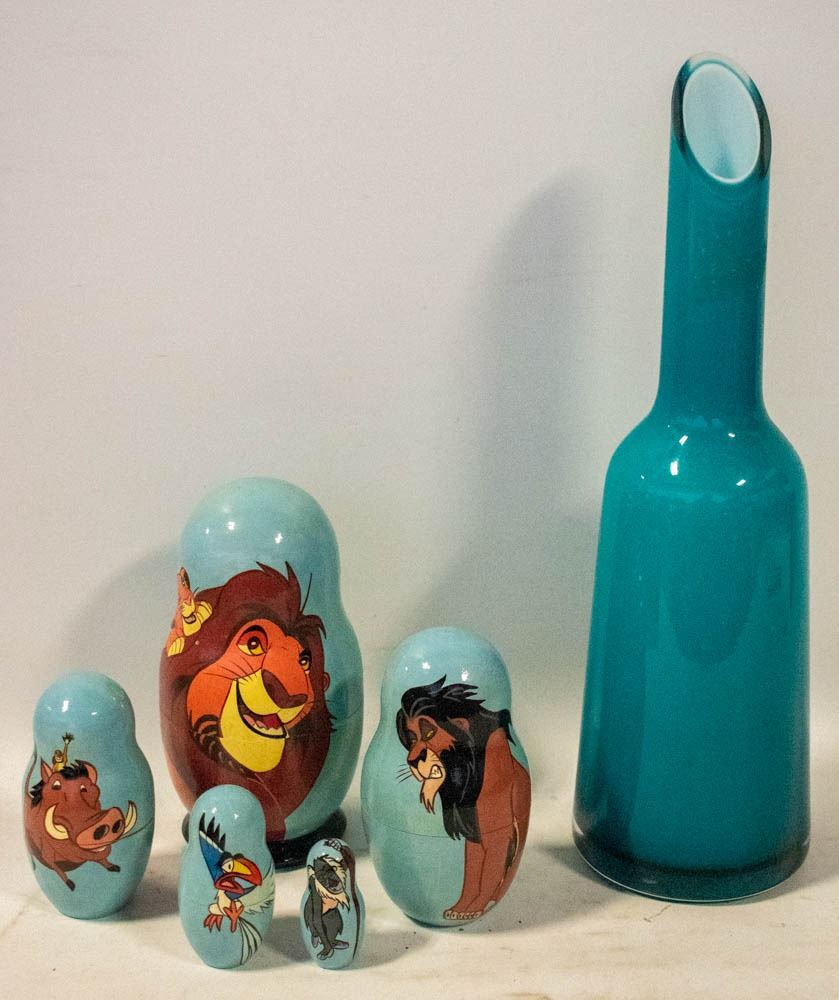 CASED GLASS VASE WITH LION KING NESTING DOLL SET