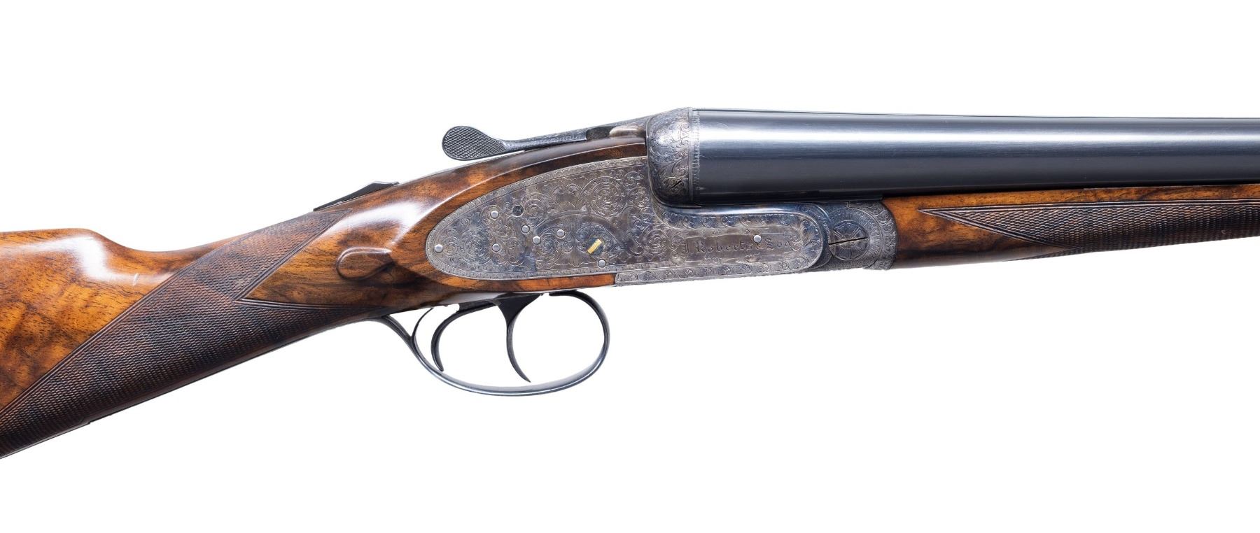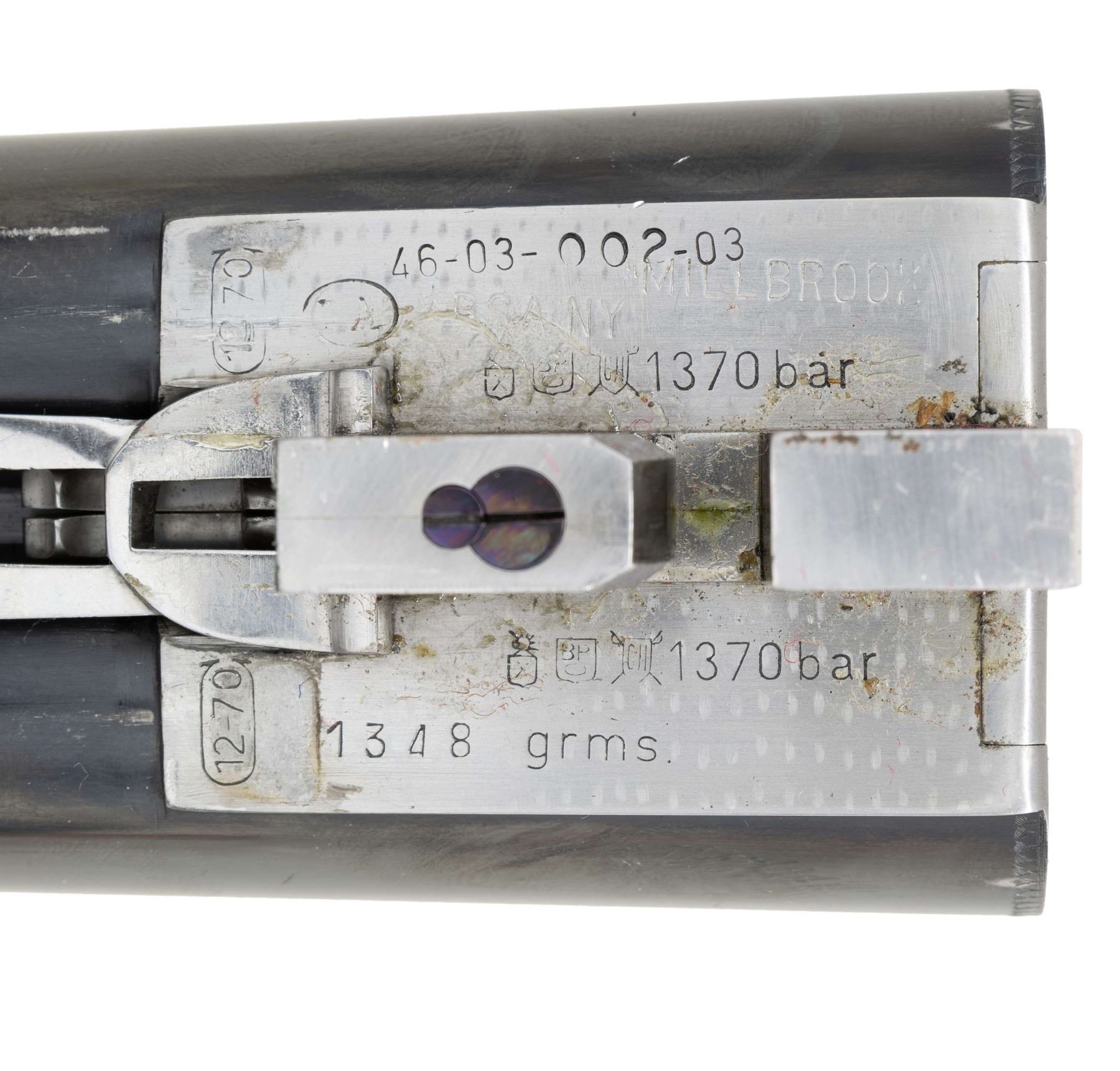 SELF OPENING SIDELOCK EJECTOR SXS SHOTGUNS. Both: Cal. 12 GA, 2 3/4". Bbls. 28" with concave game ribs. Hand detachable sidelock actions. Features include selective ejectors, double triggers (front triggers are hinged), and gold pin type cocking indicators. Long tang trigger guards have rolled right edges. Actions, forearm irons, and trigger guards have full coverage arabesque scroll engraving with floral highlights and fancy borders. Splinter forends and straight grip stocks of fine European walnut features tear drop points and wrap around point pattern hand checkering. LOP; 14 7/16" over 1/4" grooved plastic buttplates. DAC: 1 1/2". DAH: 2 1/8" Neutral cast. Weight; 6 lbs., 14 ozs. GUN 1: S#. 46-03-002-03. Bbl. measurement: Bore diameters, Rt. .728, Lt. 728. Choke constrictions, Rt. .010 (IC), Lt. .020 (Mod). Minimum wall thickness, Rt. .031, Lt. .032. GUN 2: S#. 46-03-003-03. Bbl. measurements: Bore diameters, Rt. .730, Lt. .728, Choke constrictions, Rt. .020 (Mod), Lt. .020 (Mod). Minimum wall thickness, Rt. .030, Lt. .030. Weight: 6 lbs. 13.4 ozs. UNATTACHED ACCESORIES: the guns are housed in their original oak & leather 2 gun case with red felt fitted interior holding brass snap caps and oil bottle. Inside of case lid has J. Roberts & Sons, 22 Wyvil Road, Vauxhall, London makers label. Also included are optional custom 7/8" leather covered recoil pads for both guns. Paperwork with the guns includes an invoice from J. Roberts & Sons dated May, 2003 showing a price of $22,500. CONDITION: Both guns have over 98% bbl. blue showing slight carry wear with small marks from forend contact. Actions retain over 95% case colors with slight fading in carry areas. Blue forend irons & trigger guards show some carry wear. Stocks & forends have very good original finish & checkering showing scattered handling marks & small dents. Actions are tight & on face. All bores are near excellent. The case is in very good condition showing some handling marks on leather exterior. A delightful set of Spanish best, mfg. by Pedro Arrizibalaga of Eibar, Spain in 2003. (25-4323 & 25-4324/DS). MODERN. $10,000-15,000.