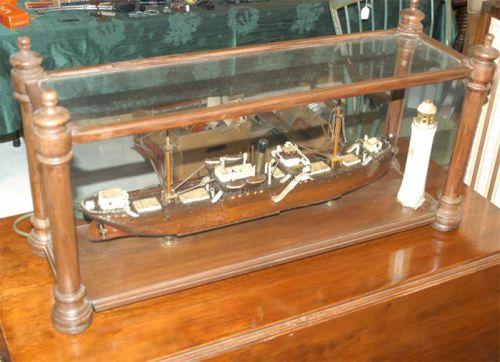 CASED MODEL OF SHIP WITH LIGHTHOUSE, 30" long, circa 1930, condition: very good, strings in the model have detached, SHIPPING: See recommended third party shippers. This item can't be packed or shipped by seller.