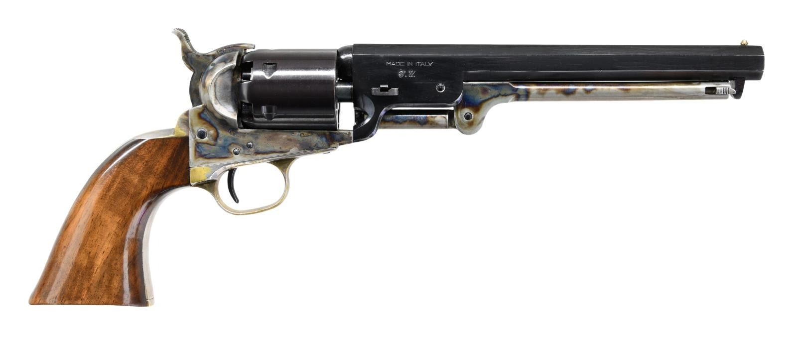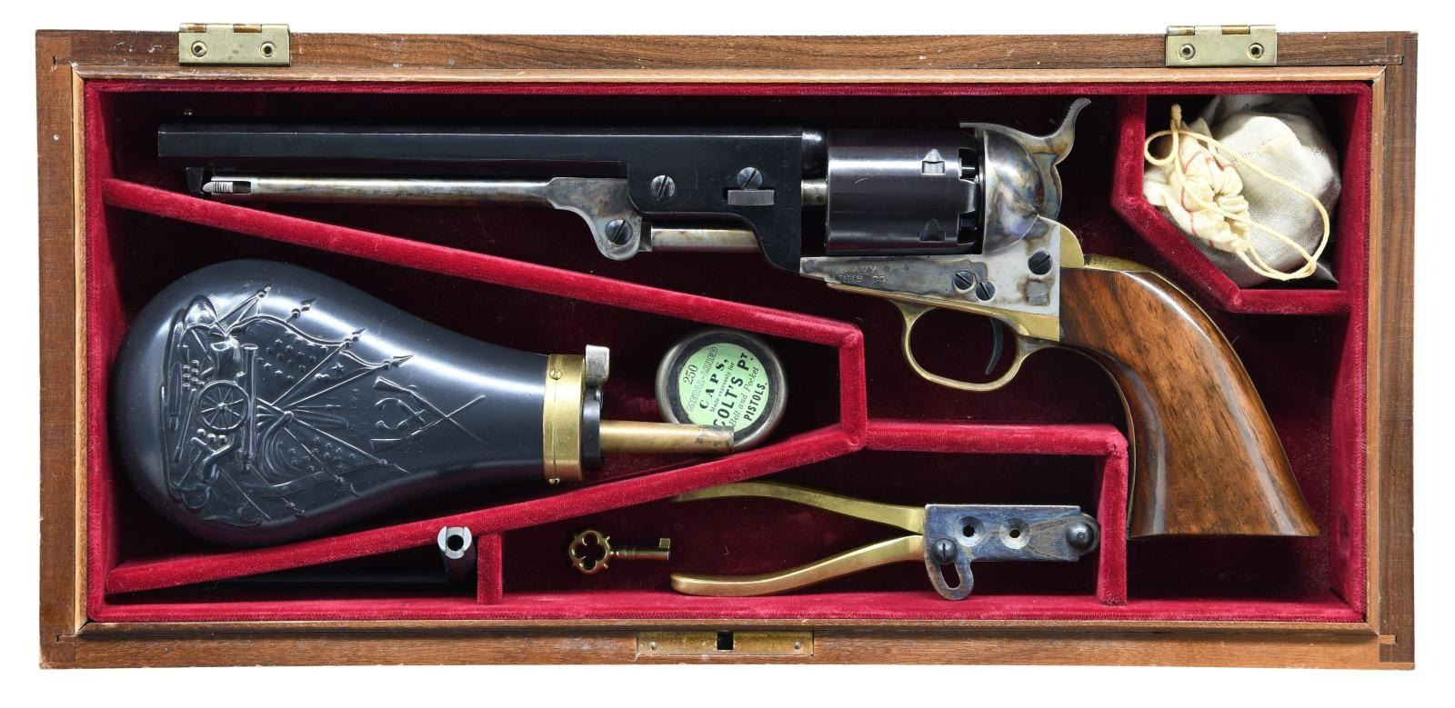 Cal. 36. S# 14. Bbl. 7 1/2". Early example w/ fixed brass stud front & simple notch rear sights, blued Bbl. w/ unfluted & unmarked cylinder. Case colored frame & lever w/ brass plated trigger guard & grip straps. Smooth wooden grips. UNATTACHED ACCESSORIES: 2 piece brass hinged wooden case (lid separated but included) w/ red velvet lined interior compartments that contain a powder flask, brass dual cavity bullet mold w/ case colored sprue cutter, nipple wrench, spare wedge, partial tin of caps, 2 screwdriver bits, key & small bag w/ 34 lead balls. CONDITION: 90% blue, 70% case color & heavily flaked brass plating. Grips show light scratches. Bore is bright w/ strong rifling & a patch of roughness in one groove near the muzzle. Case & accessories show scratches & marks from use. (01-33640/CW). ANTIQUE. $300-400.