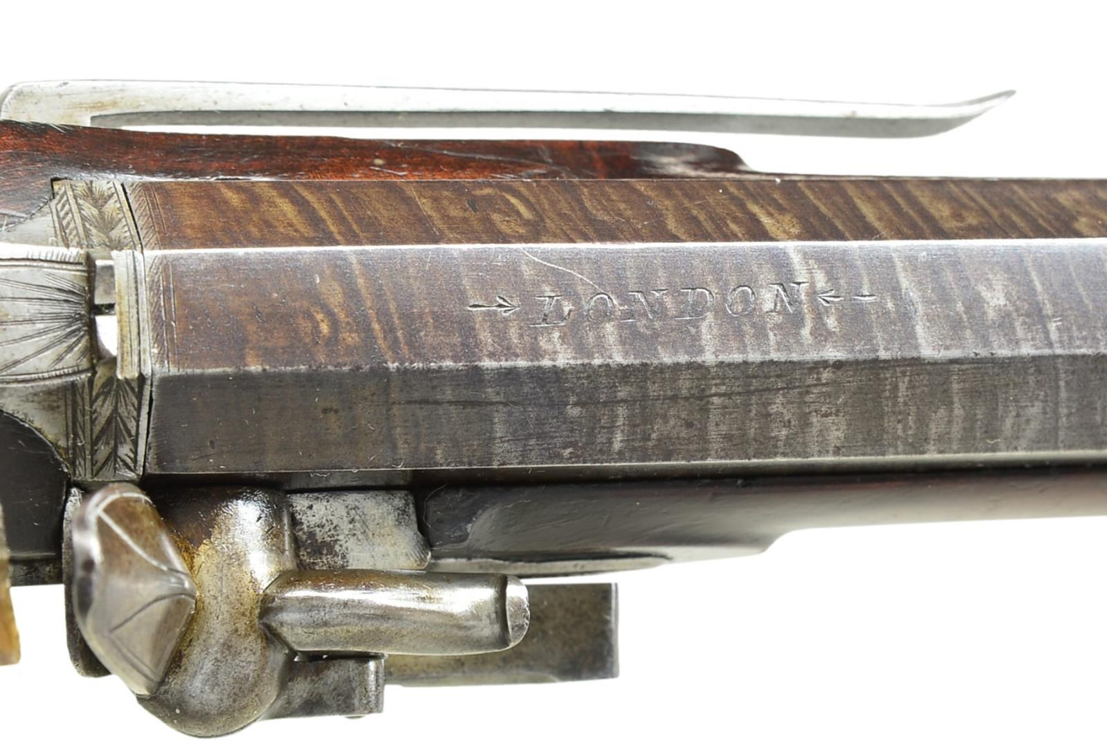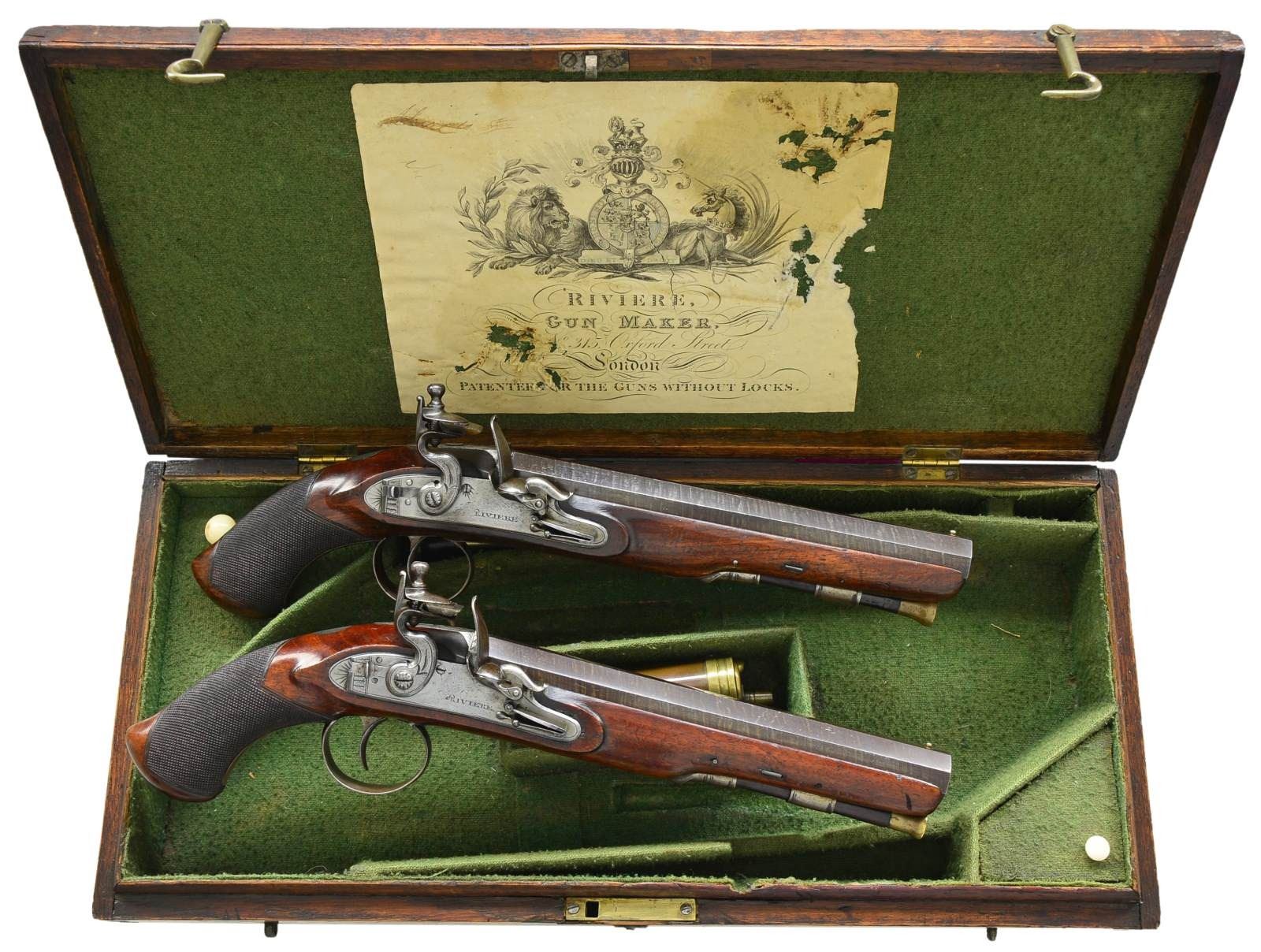 BY RIVIERE. Cal. 62. NSN. Bbl. 8". Isaac Riviere worked in London between 1809-1851. These pistols have 8" twist oct. bbls. engraved “LONDON” on tops. Engraved breech irons have integral U-notch rear sights. Locks w/ line engraved chamfered plates, rebated tails & sliding safeties are fitted w/ serpentine cocks, semi-water proof pans, bridled frizzens & roller feather springs w/ bulbous finials. Lockplates engraved “RIVIERE”. Dense walnut stocks w/ checkered fishtail grips extend to muzzles & attach to bbls. w/ captive side bolts w/ out escutcheons. Iron trigger guards have pineapple finials. Rosewood ramrods. One plain, the other w/ worm on tail, mount through beaded iron pipes & matching thimbles. Steel belt hooks are affixed to left sides. UNATTACHED ACCESSORIES: guns are housed in oak case w/ dual pendant hook closure w/ ovolo molded top which has folding flush mounted D handle. Interior is lined in pilled green cloth & has lg. paper Riviere label in lid which has 315 Oxford Street London address (after 1818). Case contains copper & brass combination powder, ball & flint flask, combination cleaning rod/worm, 2 covered compartments w/ matching cloth on covers & bone knobs hold wad punch marked “16” & some cast balls. CONDITION: bbls. retaining over 90% good quality rebrown, other metal parts show cleaning to silver & furniture w/ subsequent new brown finish. Stocks retain most of their original finish w/ numerous light marks & a few heavier. Checkering lightly worn. Bores are fine. Mechanically fine. Case exterior shows considerable wear & handling & is refinished. Interior cloth is quite good w/ minor rubs & marks. Label lightly foxed w/ losses from contact w/ lock parts & another area at right which is somewhat tattered. Partitions are good. Accessories good. Loading rod has newly turned head. (01-19869/MGM). ANTIQUE. $6,000-9,000.