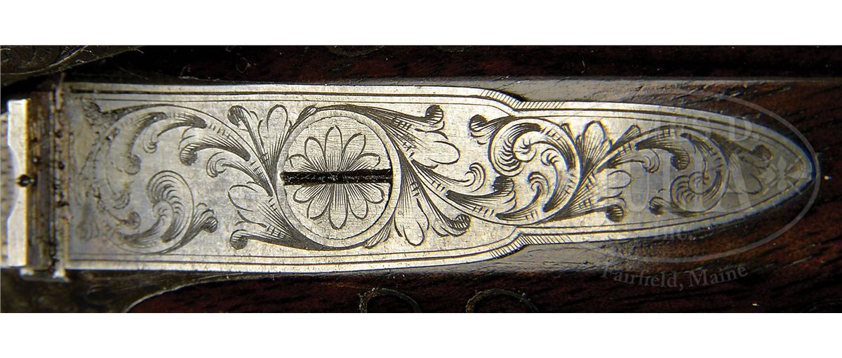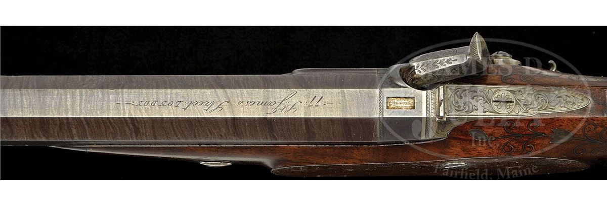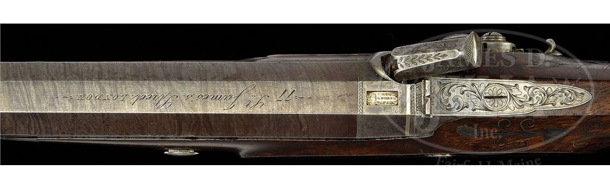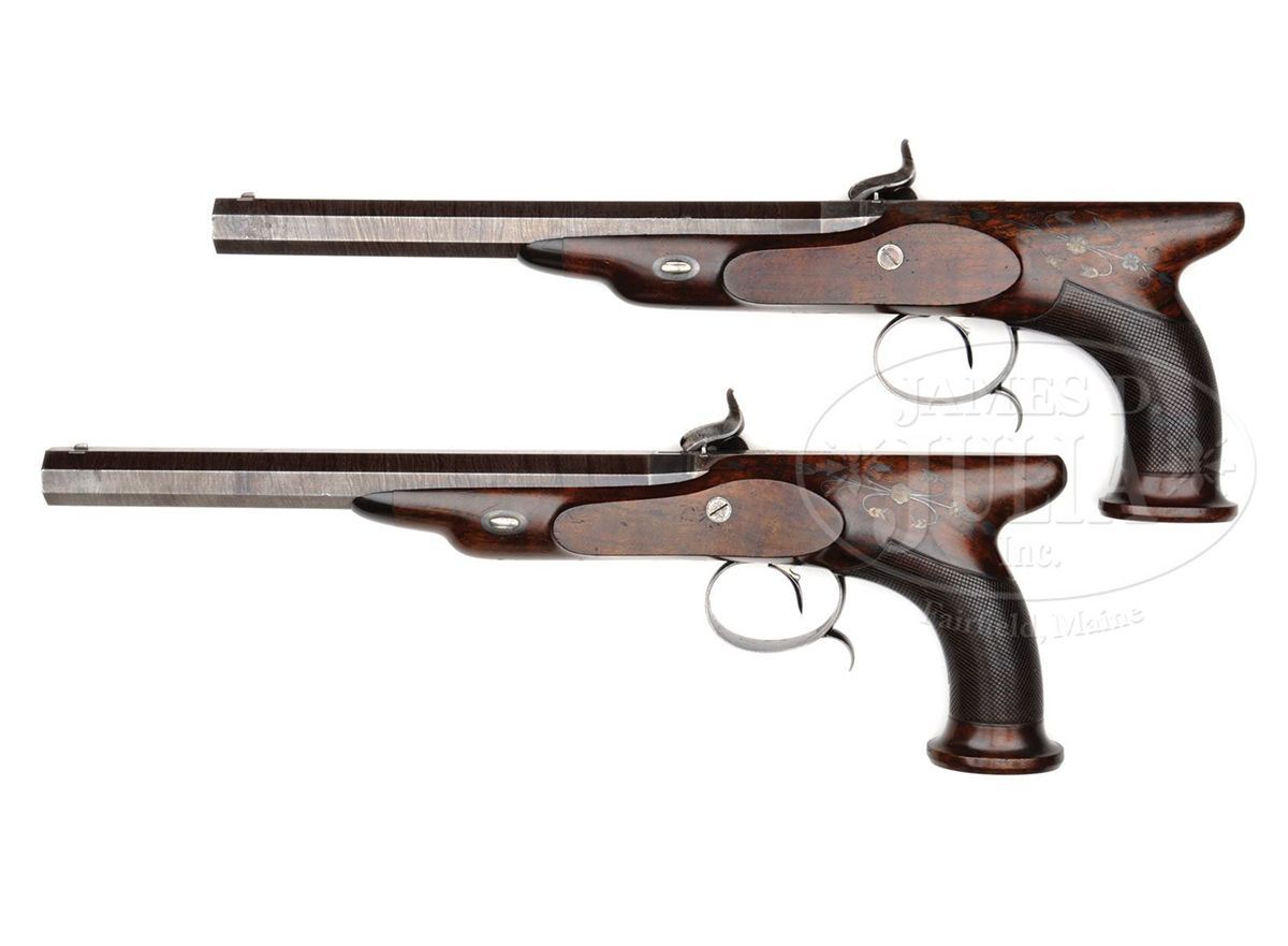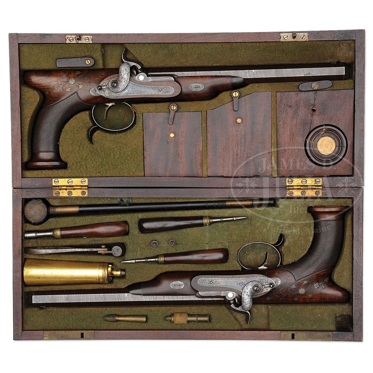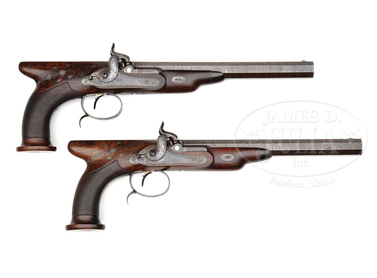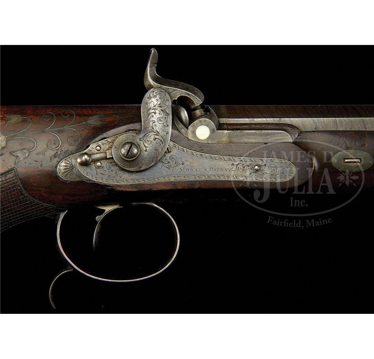 SN 1566. Cal. .425 Groove diameter (multi-groove rifling). This fine pair of target pistols by this highly regarded maker, which was succeeded by James Woodward & Sons, has 10" browned twist octagon bbls, engraved "77 St. James's Street London" (1825-1842) on top flats. Patent breeches have platinum blow-outs, and platinum poincons on tops, stamped "C Moore London Patent". There are platinum bands at breech ends. Scroll engraved breech irons have small V-notch rear sights dovetailed through. Island front action locks mount broad round bodied hammers and back sliding safeties. Lockplates are shaped in continental style with rebated tails, and are marked "C. Moore's Patent". European walnut saw-handled stocks with oval flared grips, are flat top square checkered, in scallop wraparound pattern with mullered borders. Trigger plates have stylized pineapple finials mounting set triggers, and scroll engraved trigger guards have spurs. SNs are on tips of tangs. Stocks also feature vacant silver ovals on bottoms of grips, horn forend tips, and mount to bbls with captive side nails through oval silver escutcheons. There is exceptionally fine inlaid silver wire scroll with floral highlights at each side of top rear portions of stocks. There are no provisions for ramrods. Pistols are housed in their orig two-part, center hinged, mahogany case with inset circular brass D-ring handle, and sliding lock closure. Case is lined in green cloth, and contains a wonderful array of orig loading and cleaning tools, which are french fitted. There are also mahogany covered compartments for balls, etc. Accessories include large steel patch cutter, rosewood patch box with bone top, rosewood and ebony loading rod with leather faced hammer head, two rosewood handled turnscrews, rosewood handled nipple key, gilt copper flared powder flask, and a 58 bore nutcracker type ball mold stamped "W.D" (William Davis). Also included are a pair of replacement nipples and cleaning accessories for loading rod. PROVENANCE: Henry Sturgis Morgan Collection with cover letter. Henry S. Morgan Jr. Estate Collection. CONDITION: Excellent. Bbls retain 80% of what appears to be their orig brown. Breeches, breech irons, locks and hammers retain a considerable amount of their orig case hardening color. Trigger plates, and trigger guards retain most of their orig bright blue, except bow of one gun is considerable flaked, or possibly cleaned, to silver. Stocks retain nearly all of their orig oil finish with numerous light marks from general use, assembly, and disassembly. Bores are excellent. Locks are a bit sluggish, probably from congealed oil. Case is very fine retaining nearly all its orig finish with some minor scratches and marks. Interior cloth is also very fine, faded from exposure to light. Compartment covers are missing their ivory knobs, largest cover cracked. Accessories are generally very fine, except patch box which shows numerous repairs, and a chip missing from bottom. 4-49133 MGM272