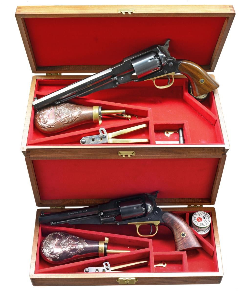 & NAVY REVOLVERS. 1) NEW MODEL ARMY. Cal. 44. S# 013597. Bbl. 8" oct. 6 Shot rnd. cyl. Blue finish w/ brass trigger guard having case colored hammer & trigger. 2 Piece walnut grips. UNATTACHED ACCESSORIES: wooden display box w/ red velour fitted interior. Box contains powder flask, 2 cavity bullet mold, tin of caps, Inline capper, nipple wrench & case key. CONDITION: over 98% metal finish showing sm. marks on cyl. Grips show sm. handling marks. Sound mechanics. Near excellent bore. (01-17736/DS). 2) NEW MODEL NAVY. Cal. 36. S# R478400. Bbl. 6 1/2" oct. 6 Shot rnd. cyl. Blue finish w/ brass trigger guard having case colored hammer & trigger. 2 Piece walnut grips. UNATTACHED ACCESSORIES: wooden display box w/ red velour fitted interior. Box contains powder flask, 2 cavity bullet mold, 2 partial tins of caps, Inline capper & case key. CONDITION: over 98% metal finish. Grips have very good finish. Sound mechanics. Near excellent bore. (01-17737/DS). BOTH ANTIQUE. $350-550.