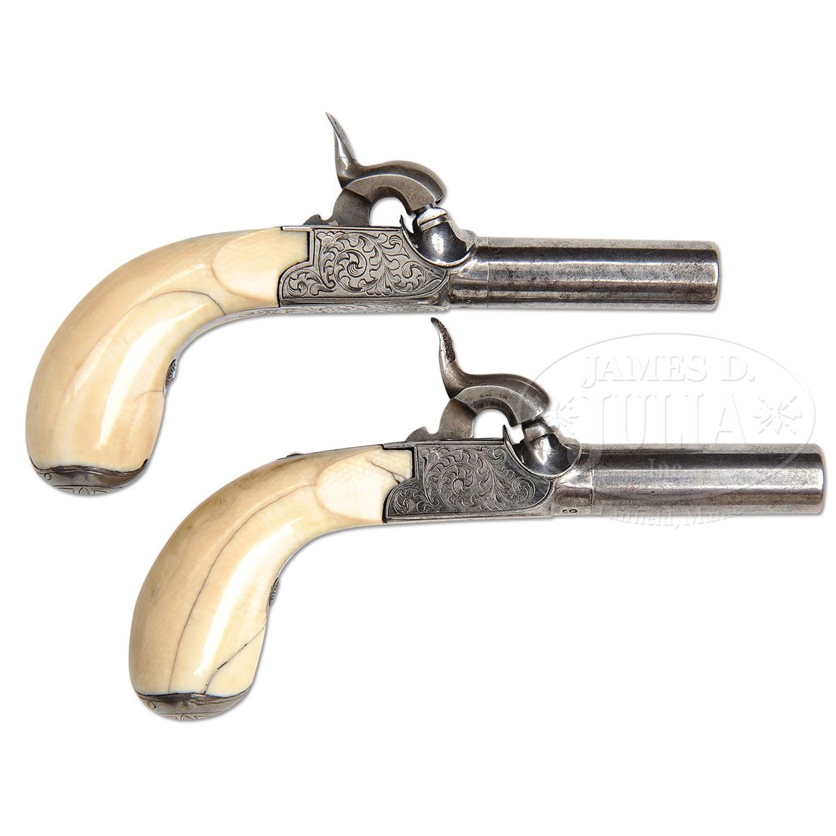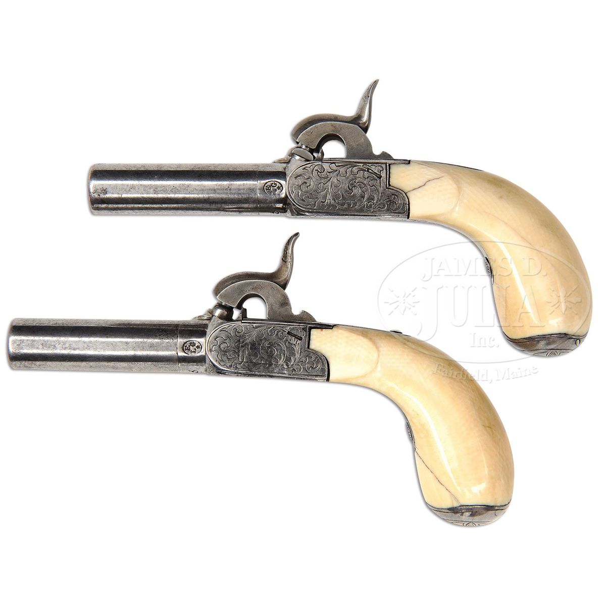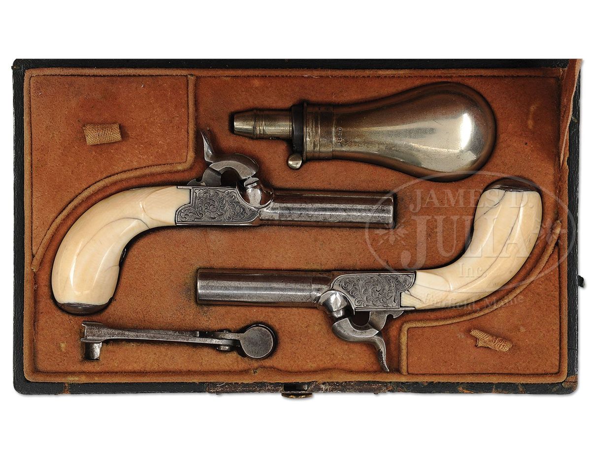 SN 963. Cal. 36. Pistols are identical, nickel finish with 1-9/16" rnd screw bbls, engraved box-lock frames & 1-pc bag-shaped smooth ivory grips with silver capbox butt caps. Frames have folding triggers & are nicely engraved in foliate arabesque patterns. Buttcaps are engraved in floral patterns. Both pistols are numbered "963". Accompanied by their orig burgundy suede lined, black morrocan leather covered case with beveled lid & lightly embossed decorations. Interior is French fitted for the pistols, a tiny "JD&S" silver bag-shaped flask with graduated spout & a tiny nutcracker ball mold with sprue cutter and a nipple wrench on one arm with a bbl wrench on the other arm. CONDITION: Pistols are very fine retaining most of their orig finish. Grips have a few age lines with an apparent crack in the toe of one pistol. Mechanics are fine, strong bright bores. Case shows light to moderate edge wear with some oxidation of the lock. Flask is extremely fine, retaining virtually all of its orig finish. Mold is very fine, cleaned to bright metal. 4-49611 JR86