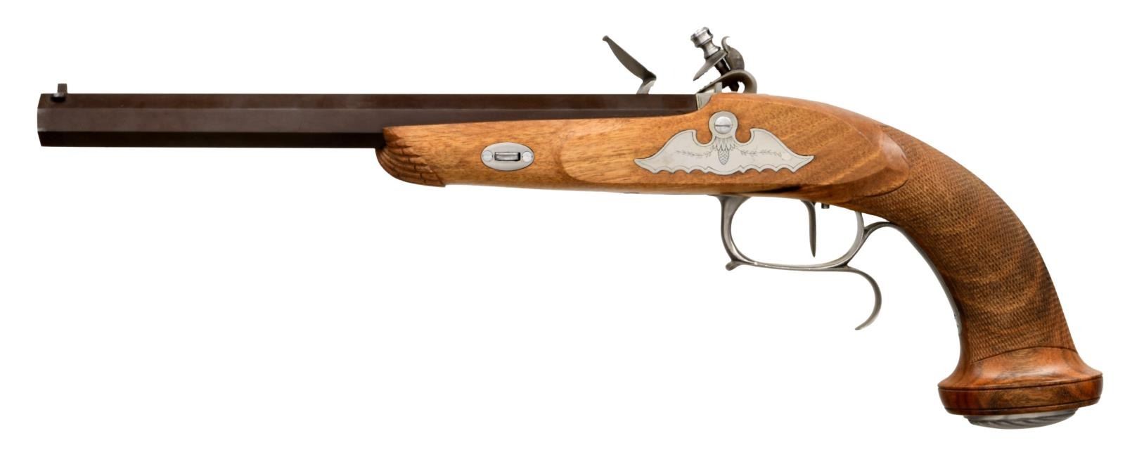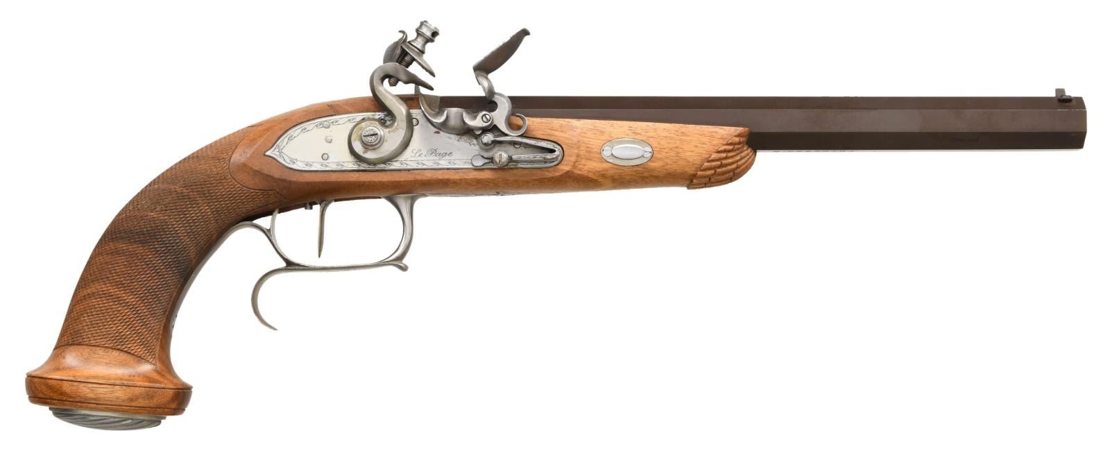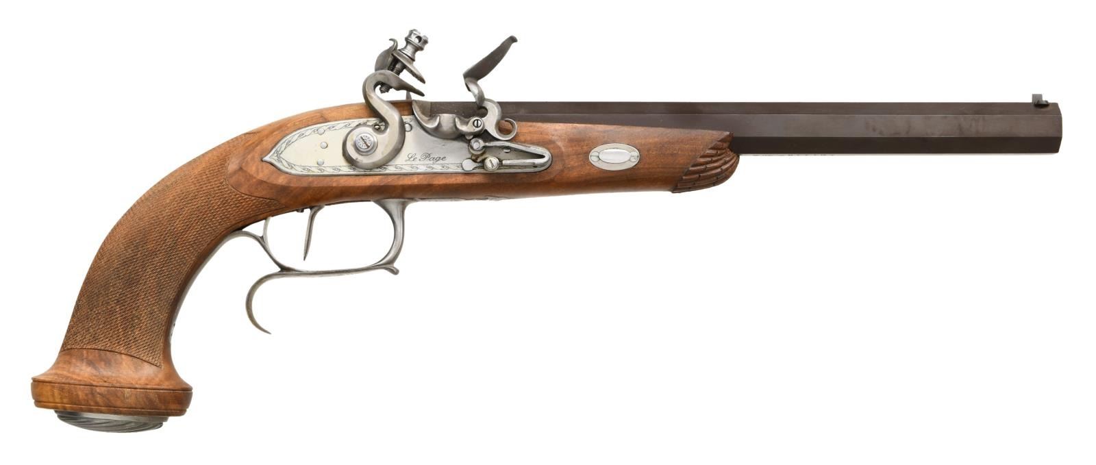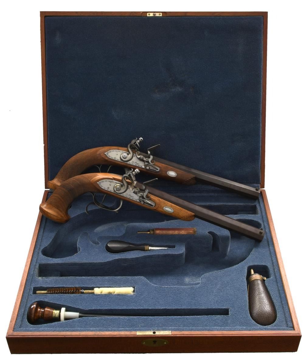 DUELING PISTOLS. Cal. .44. S# F01087 & F01118. Bbl 10 3/8". LePage dueling pistols manufactured by Pedersoli of Italy. Lockplates are engraved "LePage" and feature a light engraved border. Triggers, barrel tangs, and sideplates bear light engraving. Serial numbers are stamped on the underside of the barrels and are followed by Italian proofs. Solid wood stocks with checkering at the wrists. Hinged clamshell pommel caps, with small storage areas beneath. UNATTACHED ACCESSORIES: wood case featuring a blue velvet lining containing loading, cleaning, and disassembly tools. CONDITION: excellent, with barrels retaining bountiful amounts of their brown finish overall, exhibiting some mild marks from handling and storage. Stocks are very good, with few minor superficial marks from handling and storage. Case is very good overall. PROVENANCE: From the Lifelong Collection of Glen E. Mattox. (01/22417/MLW). ANTIQUE. $600-800.