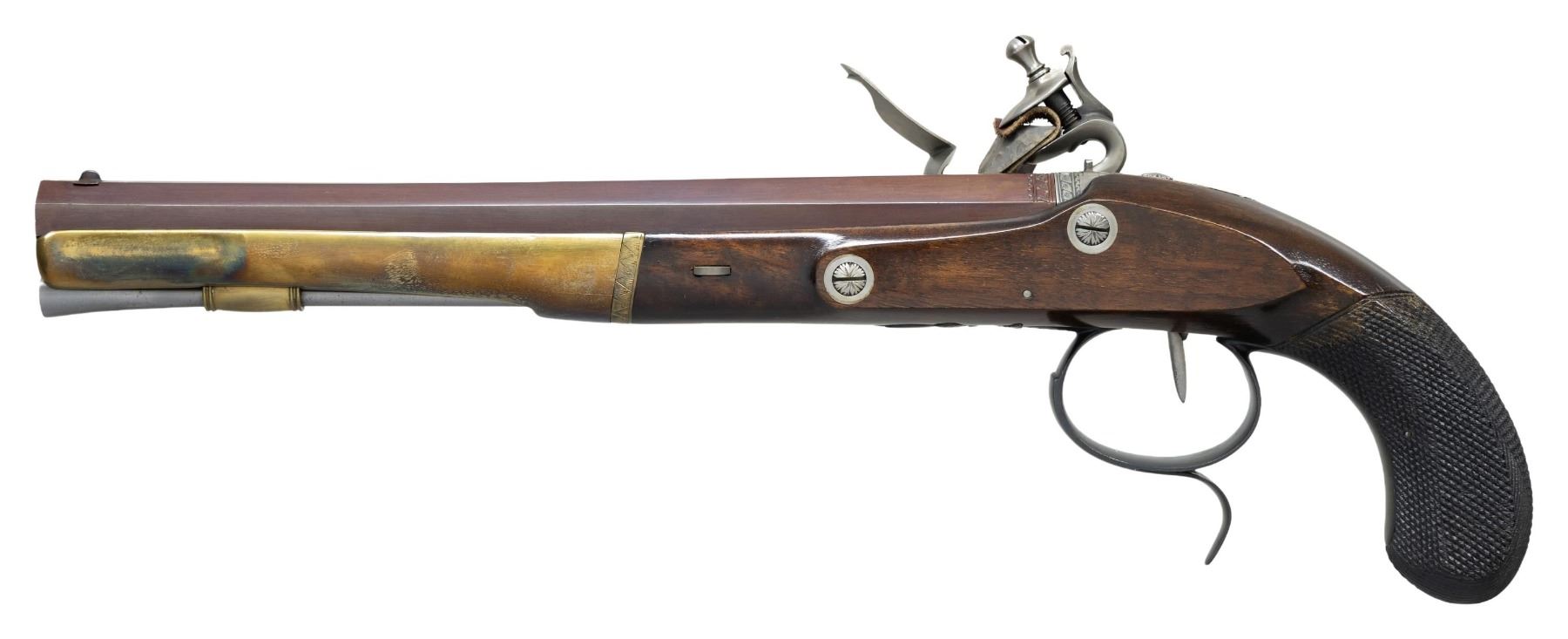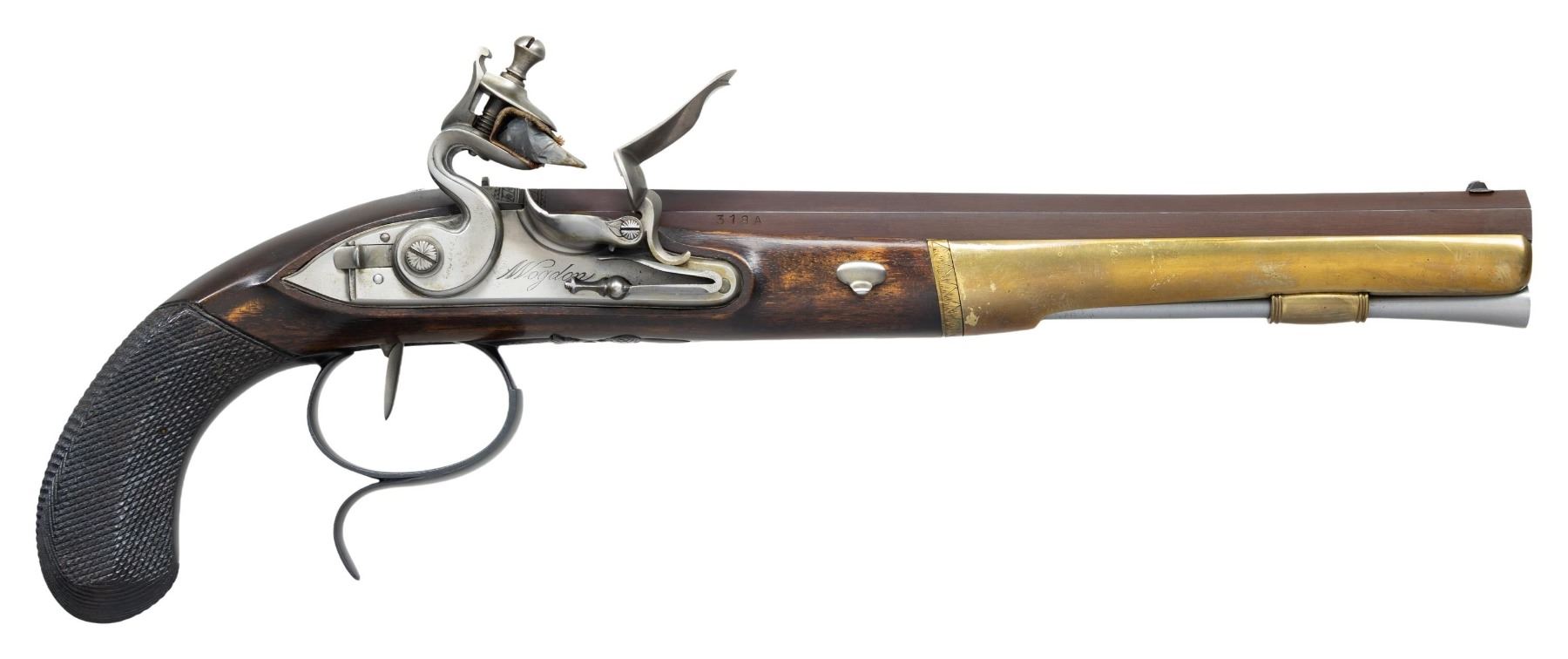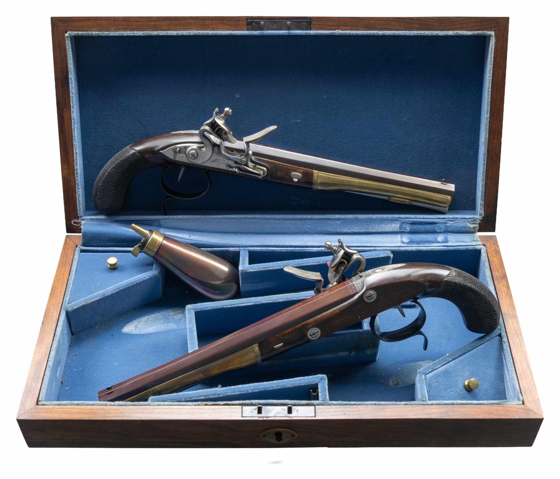 WOGDON FLINTLOCK DUELING PISTOLS. Both Cal. 54. S#'s 318A & 318B. Bbls. 9 1/2". Blade front sights. Notch rear sights. Pair of dueling pistols made in 1976 for the US Historical Society to commemorate the infamous Burr & Hamilton duel. Locks both marked "WOGDON". Browned bbls. marked "WOGDON LONDON". Checkered walnut stocks with brass forends. Steel ramrods. UNATTACHED ACCESSORIES: blue velvet lined case with powder flask, key, spare trigger & matching certificate of authenticity. Case lid has 2002 dated presentation plaque. CONDITION: wood shows some light handling wear. Brass is turning to a yellow patina with light tarnishing. Other metal parts show minimal wear with some minor oxidation specks. Actions function properly when hand cycled. Very good plus bright bores. (01-27154/MJC). ANTIQUE. $1500-2250 for pair.