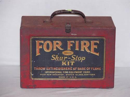 CASED SET (6) SHUR-STOP FIRE GRENADES W/ CONTENTS IN ORIGINAL PRESSED STEEL CARRYING CASE - LOSSES and PAINT WEAR TO CASE;