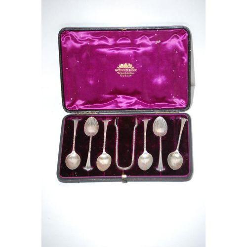 CASED SET ENGLISH SILVER DEMI SPOONS - 19TH CENT. LONDON W/ PMJ MAKERS MARK, 6 SHELL FORM SPOONS & SUGAR TONGS IN VELVET LINED LEATHER CASE-WATERHOUSE & CORP THE QUEENS JEWELERS DUBLIN - WEAR & MINOR IMPERFECTIONS