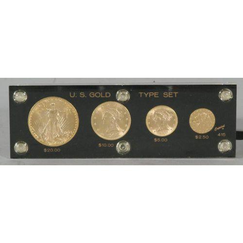 CASED SET OF AMERICAN GOLD COINS 1914 $20, 1901 $10, 1881 $5, and 1914 $2 1/2 CONDITION REPORT: the three bigger coins all nice, the small one well worn. PACKING AND SHIPPING: We offer packing (double boxed in most cases) and shipping of this item within the Continental United States by USPS or UPS (our choice- boxes over 30lbs or oversized may be recalculated based on buyer's location), NOT INCLUDING INSURANCE (it will be added when we know the sales price) for $20