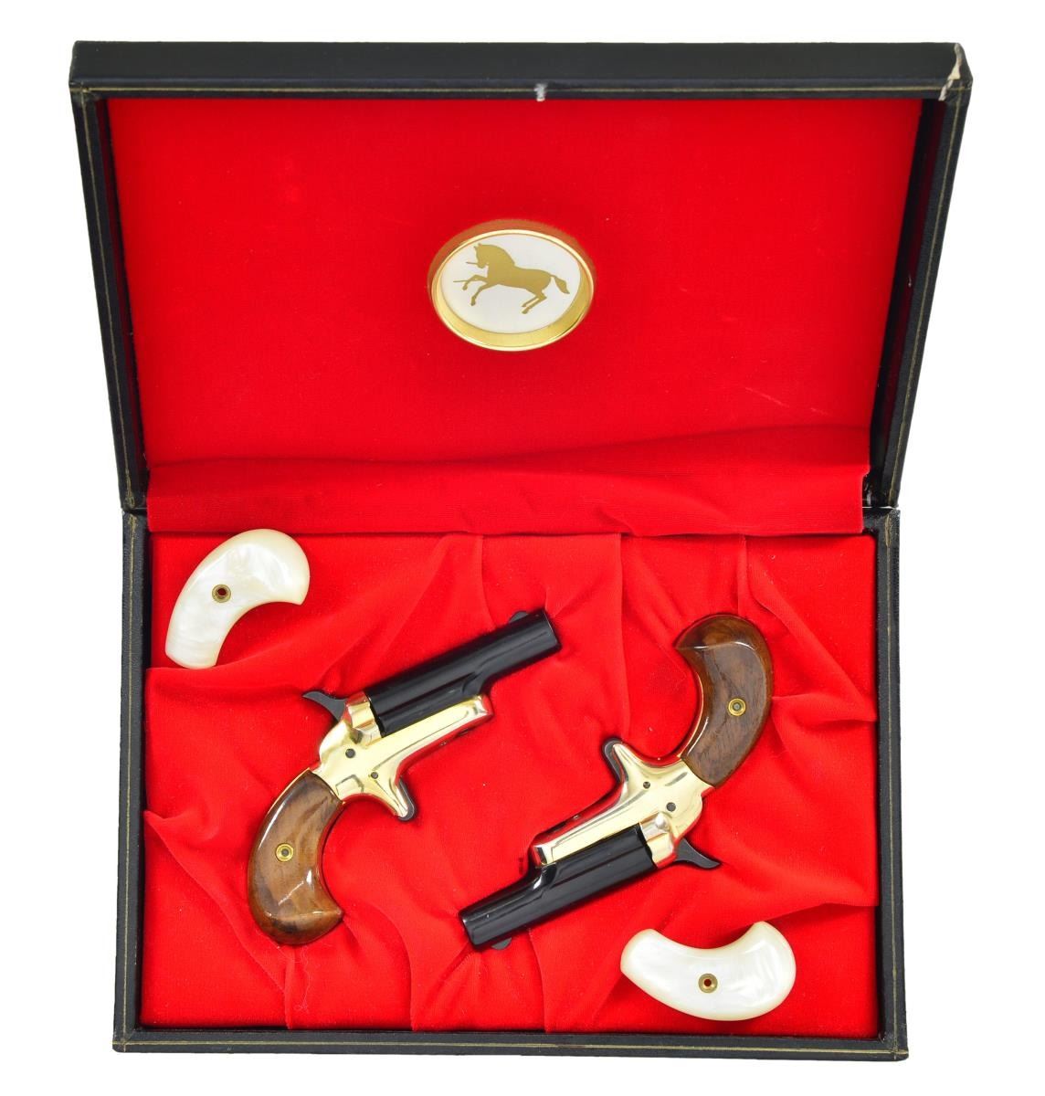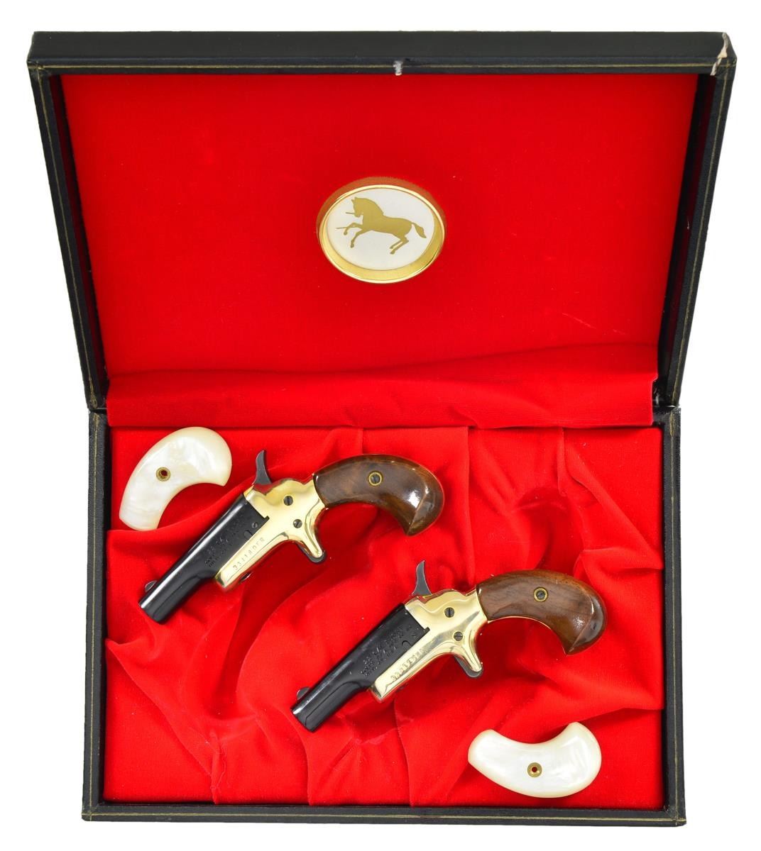 Cals. both 22 short. 1) S# 33418DER. 2) S# 33417DER. Bbls. 2 1/2". Both pistols have black finished bbls. w/ gold anodized frames. 2 Piece walnut birdshead grips. UNATTACHED ACCESSORIES: Lord case w/ red velour interior, instruction manual, warranty card & one set of pearl style grips w/ screw. Case shows some staining, light tears & top half is off center. Pearl style grips have a repaired chip at bottom of right panel. CONDITION: both sets of walnut grips are near excellent w/ a couple minor handling marks. Both pistols retain 98-99% original finish. Bores show scattered oxidation. (22-2759 & 22-2760/MJC). MODERN. $350-500.