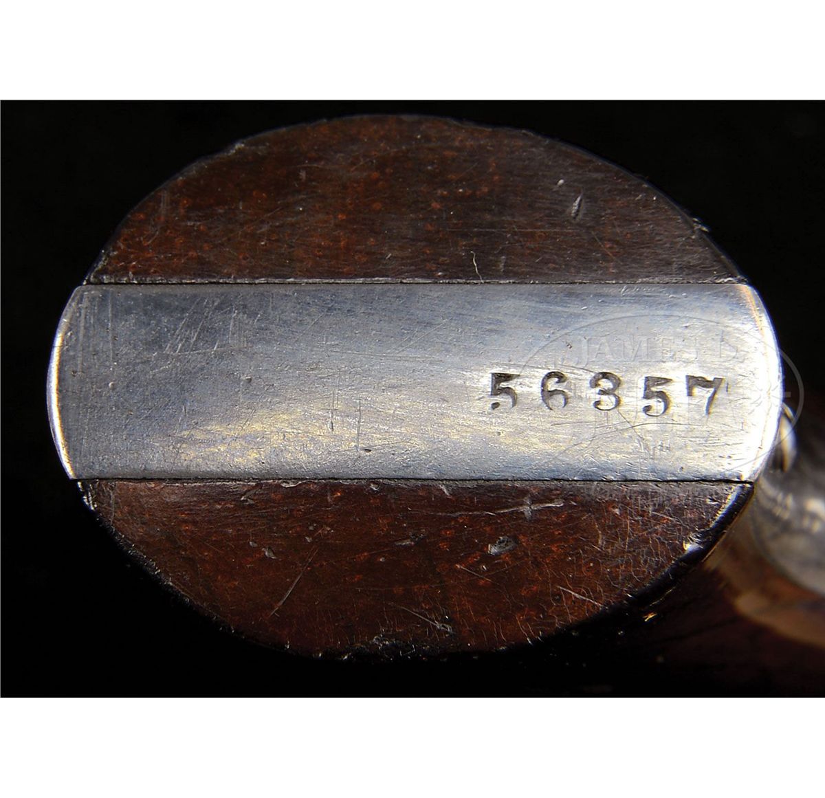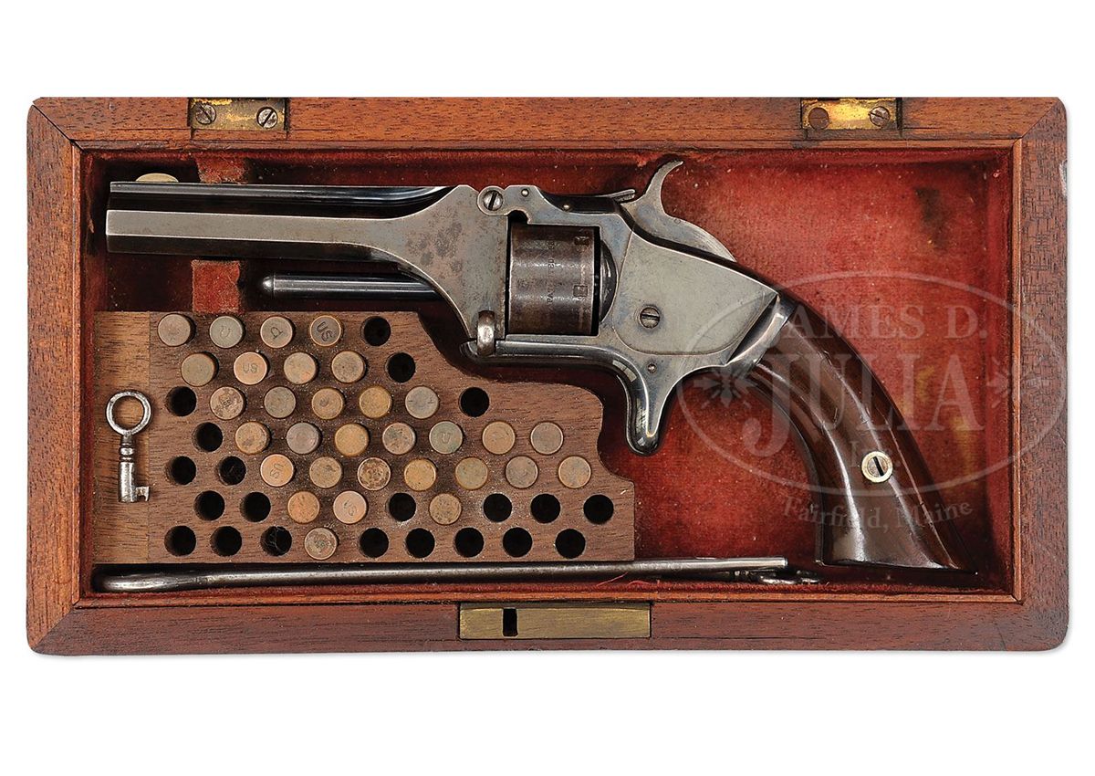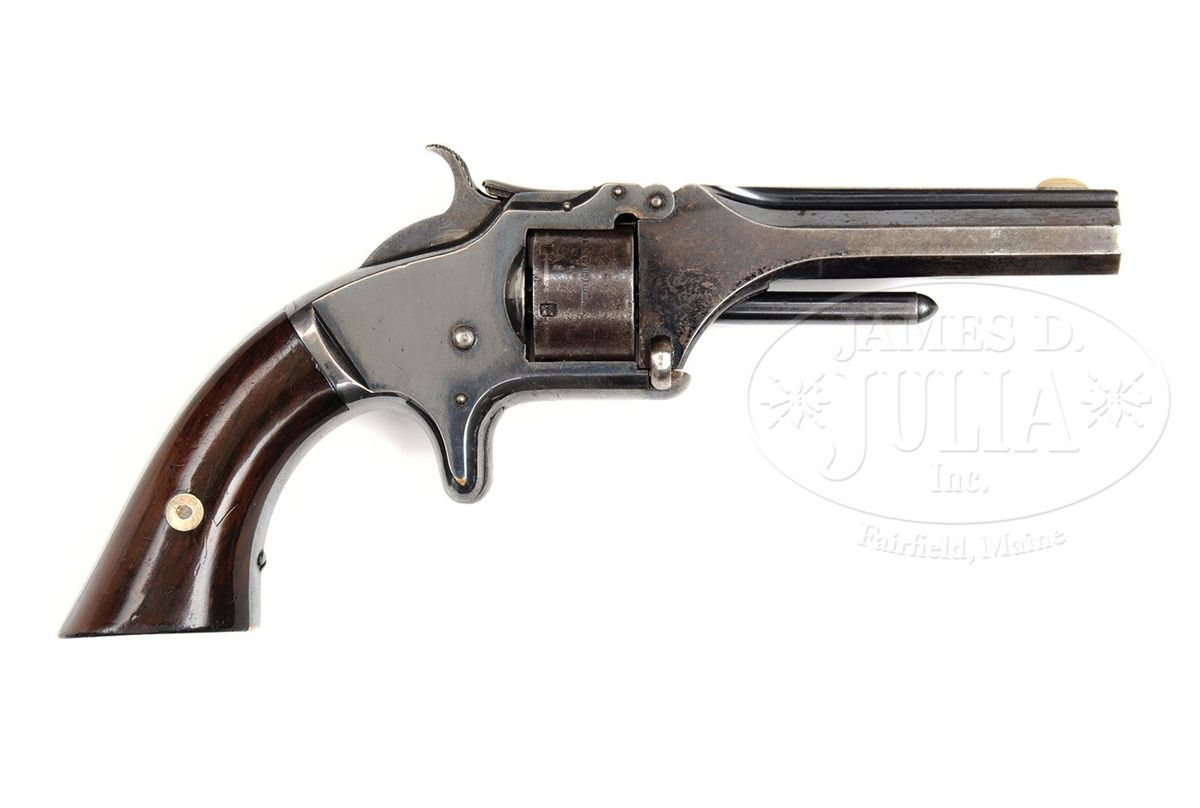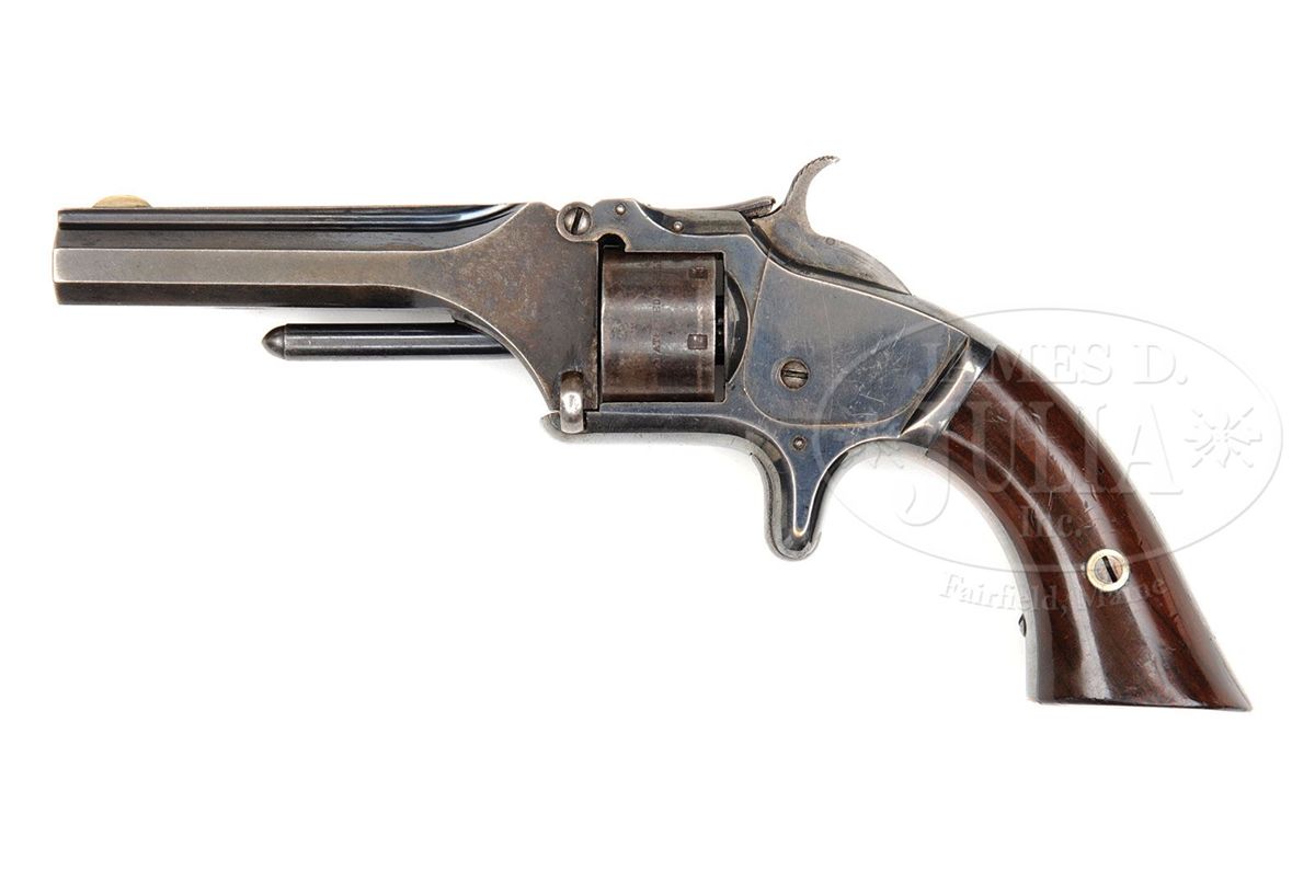 SN 56357. Cal. 22. This is a very fine example of a Smith & Wesson Model #1 22 cal. 2nd issue revolver that retains most of its orig finish and is beautifully cased in a varnished walnut box. This gun conforms to other standard Smith & Wesson Civil war era pistols of this model. The gun has matching assembly numbers, and the SN is stamped on the inside of the grip. PROVENANCE: Marlan Polhemus Collection. CONDITION: Bbl retains about 60% of its bright blue finish with remainder silver/brown. Cylinder retains traces of bright blue finish with balance brown/silver. Bbl and cylinder markings are crisp and easily discerned. Frame retains about 98% of its silver finish with only reduction on backstrap where there are many small scratches possibly an attempt at crude initials. Rosewood grips are sound, well fitted and retain 98% of their orig varnish. Walnut casing is overall sound, solid and in fine condition with one age crack in lid and soiling to red velvet inside. Case retains about 25 rim-fire cartridges. 4-48730 JS86
