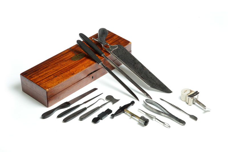 American, 19th century, wood, mixed metals. Fitted mahogany cased surgical set containing thirteen amputation and trephining instruments including a petit tourniquet, amputation saw, artery forcep, double edged amputation knife, Hey's saw, trephine, bone brush. Some are marked Sharp & Smith (Chicago, IL). 2 3/4"h. 15 3/4"w. 5 1/2"d. Imperfections.