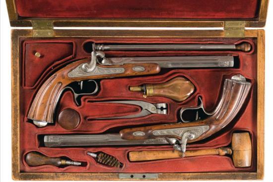 Two Percussion Target Pistols in Case~ Engraved Percussion Target Pistol in Case with Accessories Blade and adjustable notch sights, leaf engraved barrel and lock plate, adjustable trigger, finger rest trigger guard and ribbed grip with engraved buttcap. Metal cleaned bright. In case with shooting accessories, flash, bullet mold, wooden mallet, nipple wrench with wooden handle, bore brush, and wooden cap container.