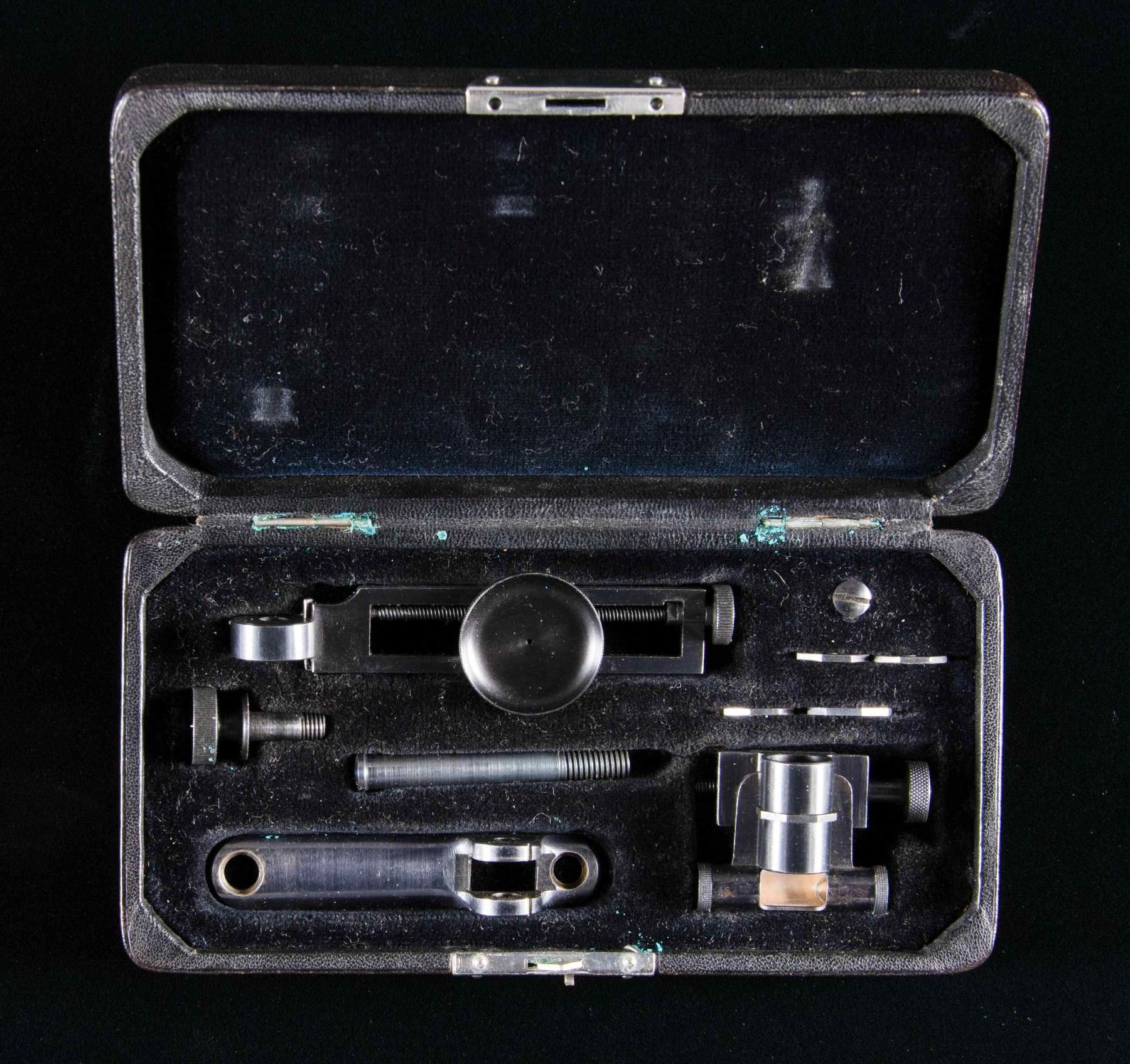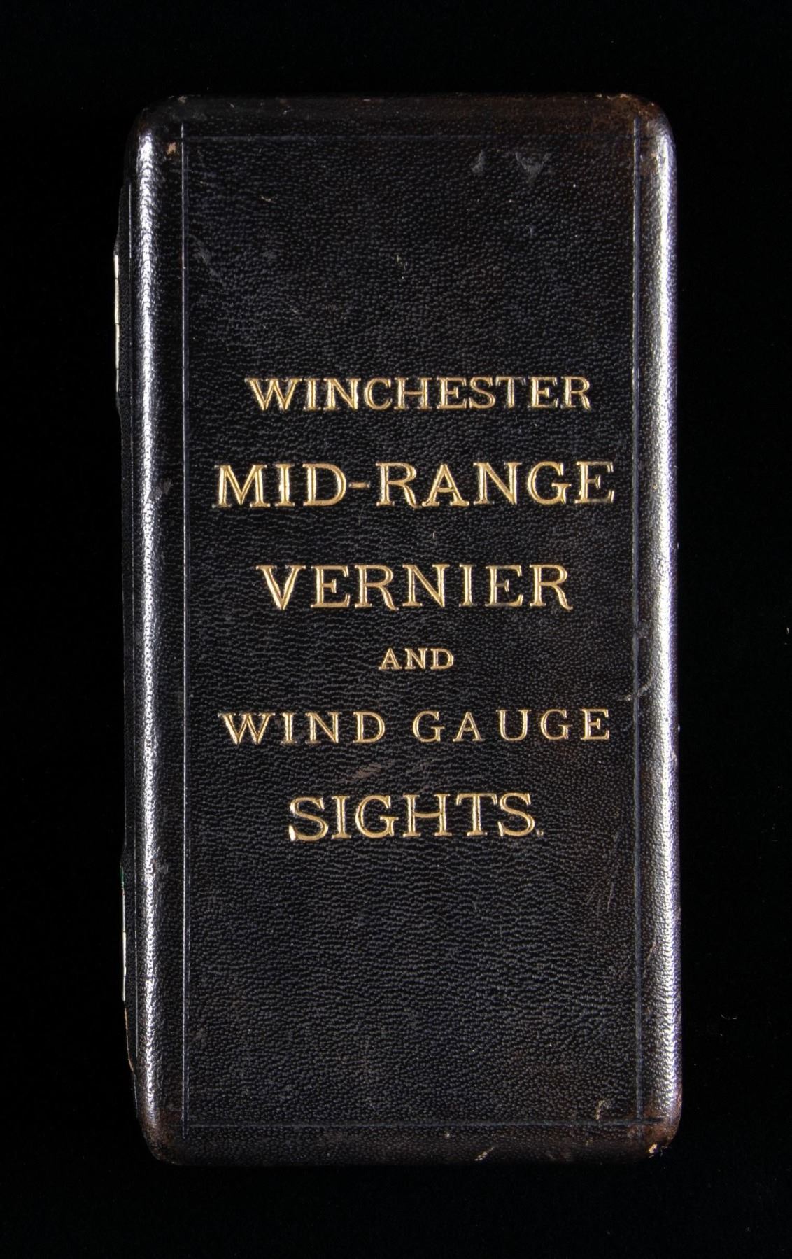 SIGHT SET. Set consists of sight staff with a 15/16" disc, sight base, attachment screws, and wind gauge globe front sight with 4 extra interchangeable sight discs. Leather wrapped case has black velour fitted interior. Lid of case has gold filled markings "WINCHESTER/ MID-RANGE/ VERNIER/ AND/ WIND GAUGE/ SIGHTS.". Case dimensions are 5.837"x3.053"x.309". This exact example is pictured on page 130 of "American Rifle Sights" by Tom Rowe. CONDITION: sights are in very good condition retaining over 90% blue finish. Case exterior and interior show light wear and handling marks. (02-25099/DS). NON-GUN. $4,500-6,500.