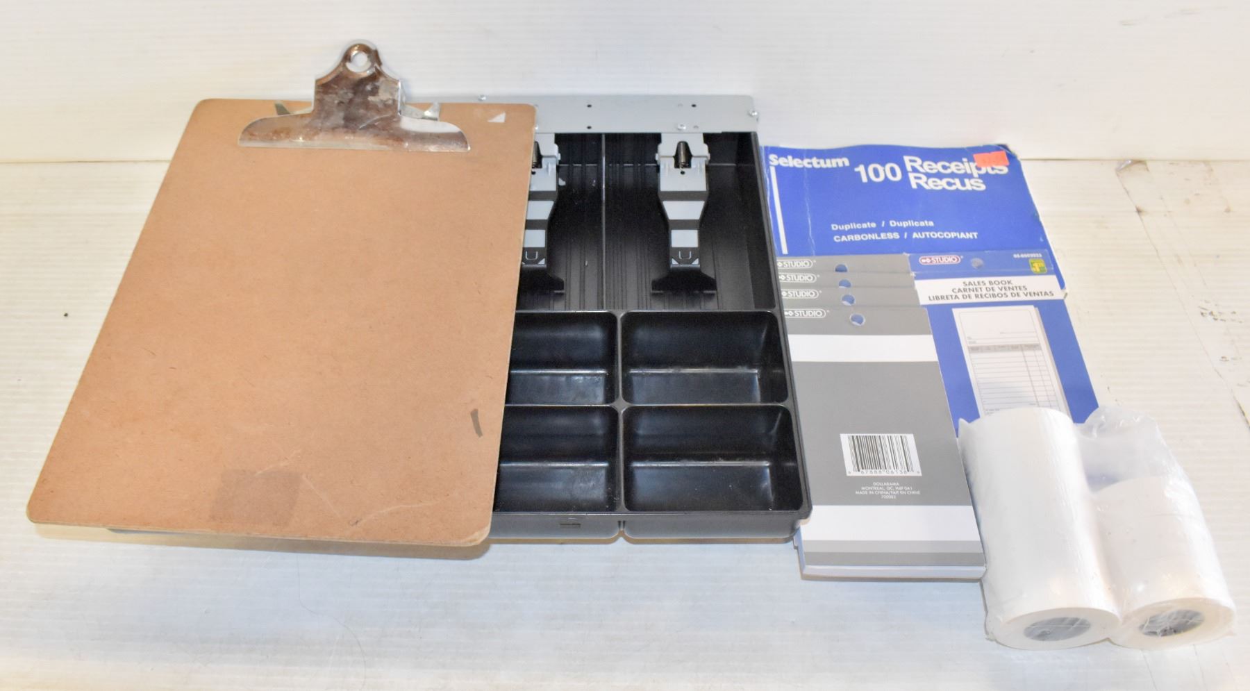 CASH TRAY, 5 NEW BILL BOOKS, CLIP BOARD, PRICE STICKERS