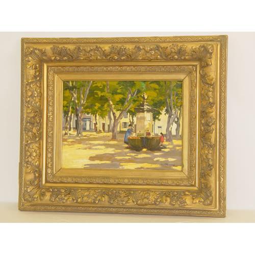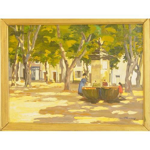 CASIMIR RAYMOND OIL ON CANVAS OF VILLAGE FOUNTAIN W/ WOMEN DRAWING WATER W/ DWELLINGS & TREES-SIGNED C. RAYMOND ON LOWER RIGHT IN A GILT CARVED PLASTER FRAME (13" X 18") - PROFESSIONAL RESTORATION, 3 PATCHES ON BACK, LOSSES TO FRAME, IMPERFECTIONS