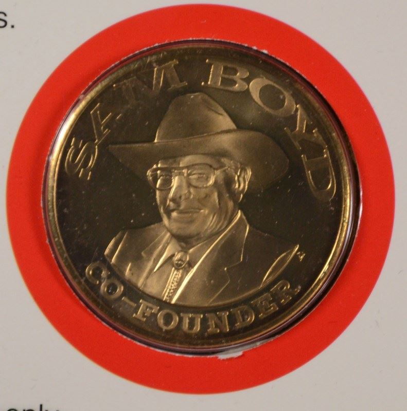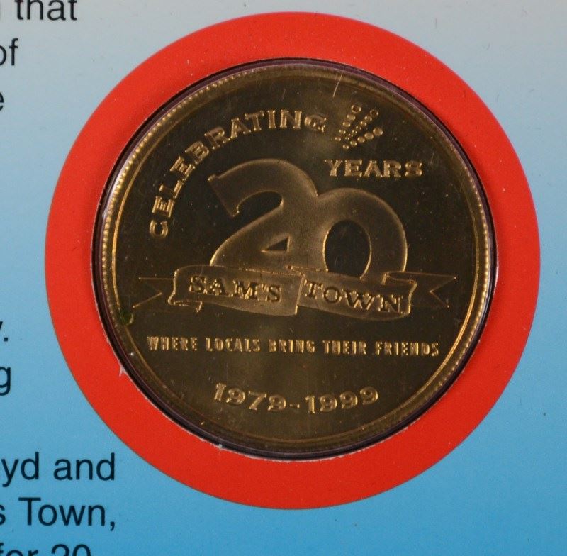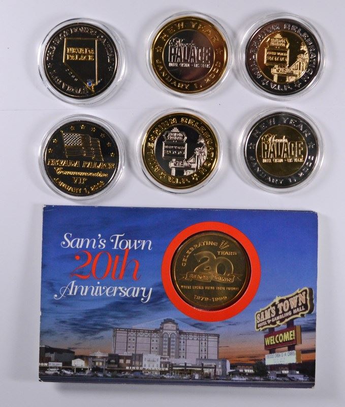 CASINO TOKEN LOT: SAM'S TOWN 20TH ANNIV BRASS COIN, 2-SILVER NEVADA PALACE
