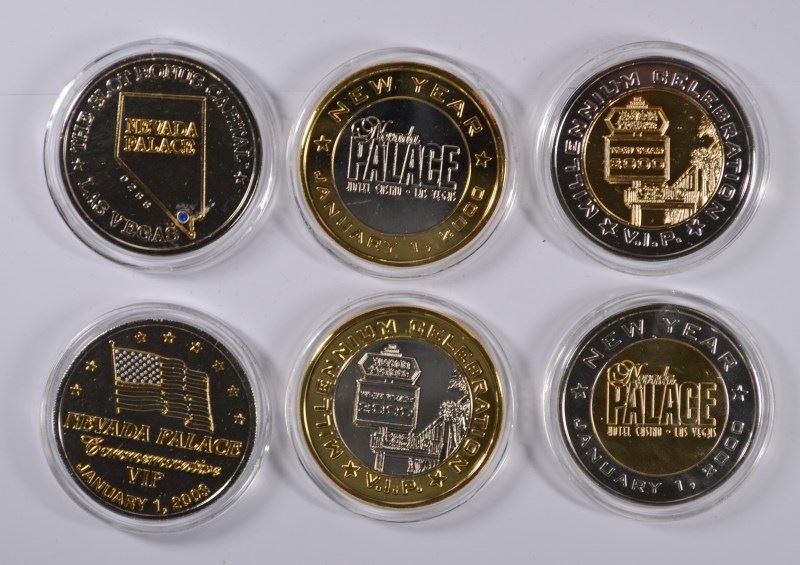NUMBERED GAMING TOKEN JAN 1 2003, & 2-NEVADA PALACE MILLENNIUM CELEBRATION GAMING SET. EST 60.00-70.00