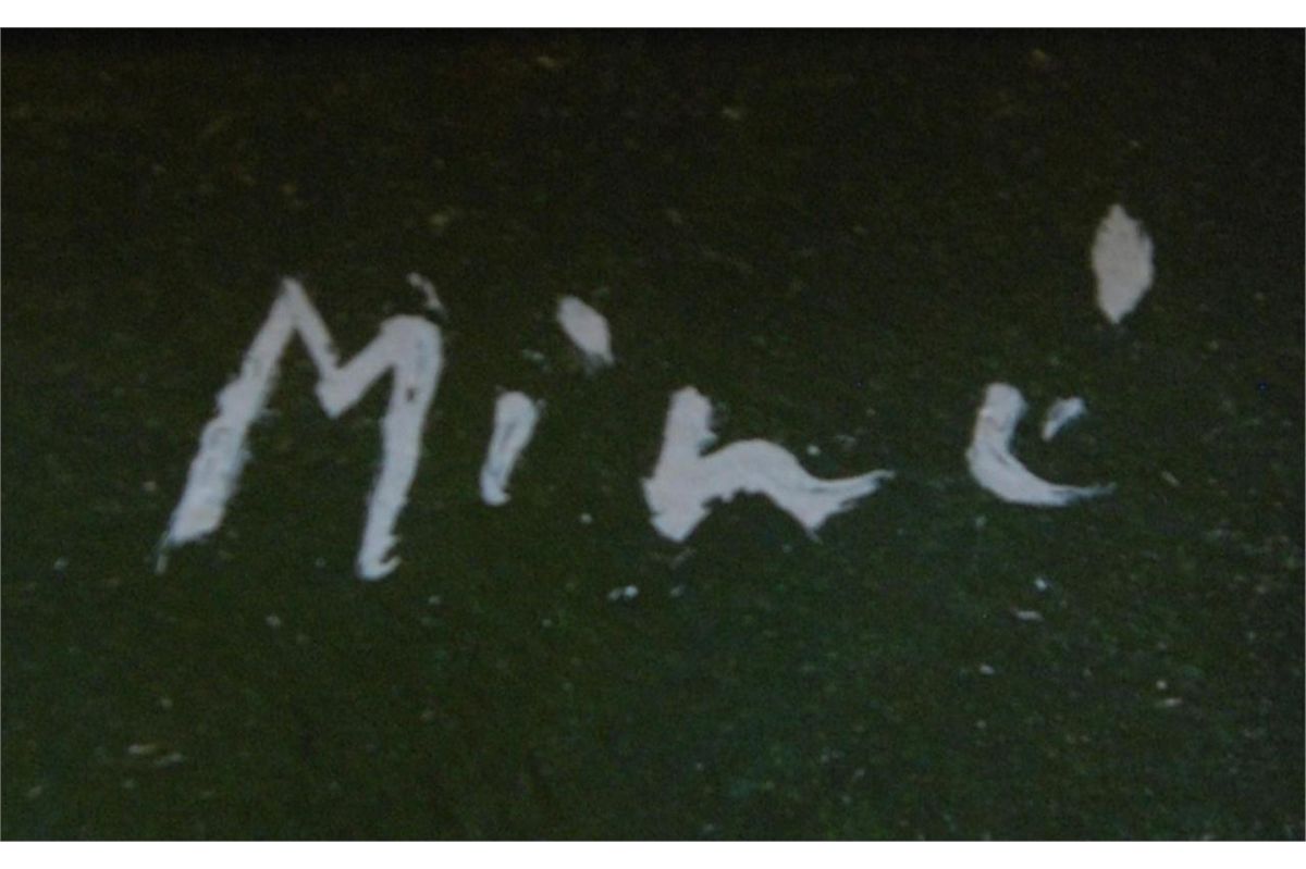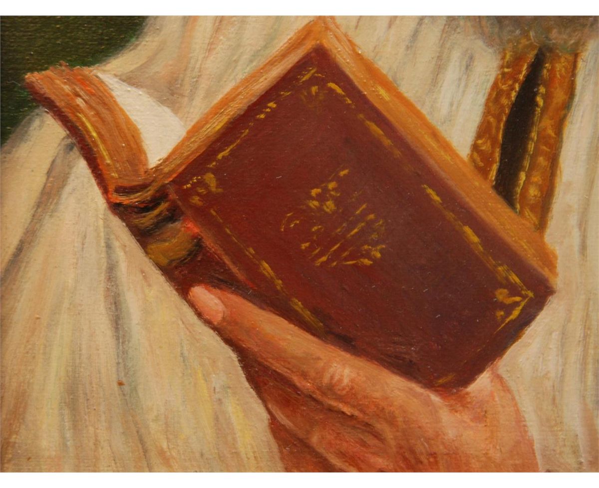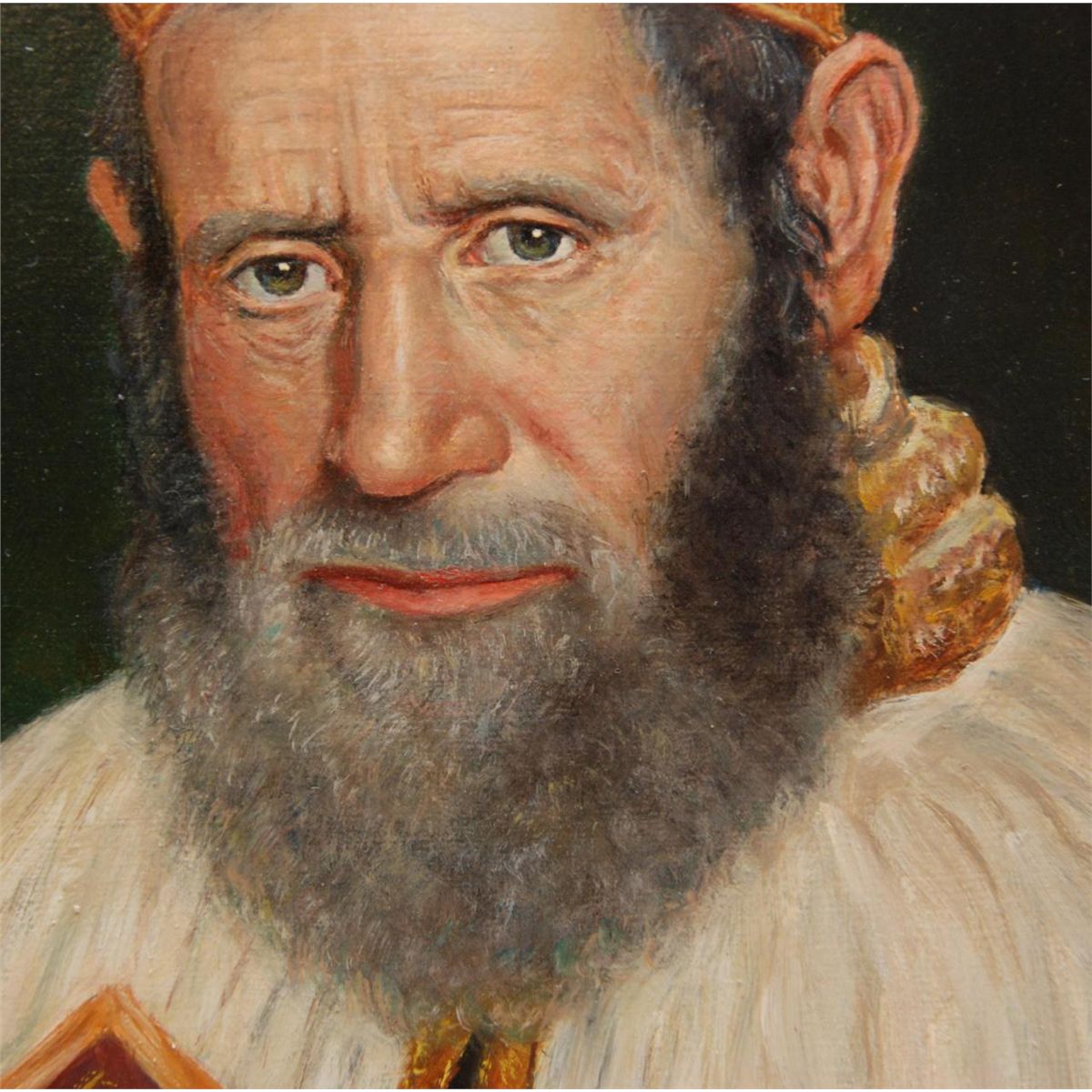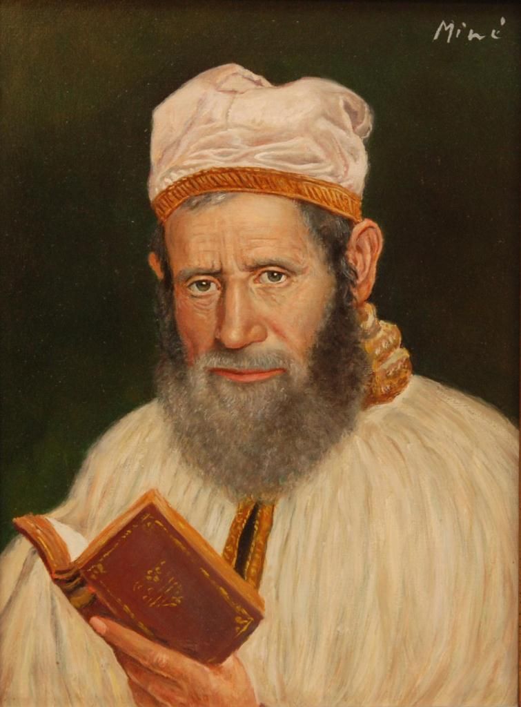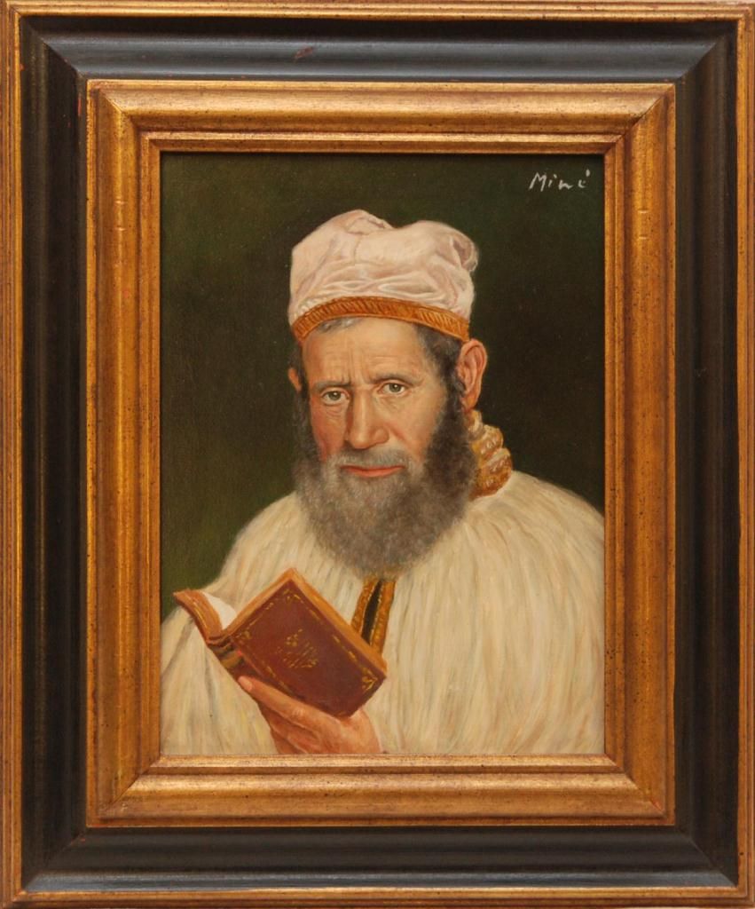 Casper Mine (FRENCH, 1905) oil painting on board depicting a sleeping Rabbi. Signed upper left. Mounted in gilt floral scrolled frame. Measures 12" height x 9" width + 2 1/2" frame (30.4cm x 22.8cm + 6.3cm).