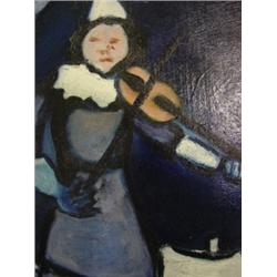 Cassin, modern acylic on canvas painting of figurine playing violin in street. Signed in lower right. 18.75" x 25" framed.