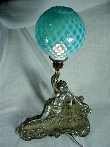 CAST ART NOUVEAU NUDE CONVERTED LAMP WITH BLUE ART GLASS GLOBE. 19"