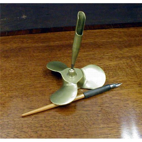 form of a propeller! </td></tr><tr> <td> </td></tr><tr> <td>Reference #: M108</td></tr><tr><td>Condition:Excellent</td></tr><tr><td>Year:1880-1925</td></tr><tr><td>Country:USA</td></tr><tr><td>Maker:unknown</td></tr><tr><td>Height:5.25</td></tr><tr><td>Depth:4.75</td></tr><tr><td>Width:4.75</td></tr><tr><td>Weight:0.75</td></tr><tr><td>Title:CAST BRASS PEN HOLDER AND VINTAGE PEN</td></tr><tr><td>Style:Modernist</td></tr><tr><td>Materials:Brass, Wood, Metal</td></tr><tr><td>Location:Sharon, CT 06069</td></tr></table>