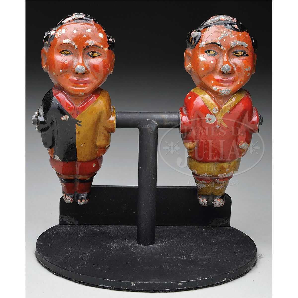 Two cast aluminum hand painted target figures. Shooter would hit top side of figure to flip over. Polychrome type finish with typical chipping from use. Base is not original. SIZE: 6-1/2" t overall. Figures are 5-1/2" t. CONDITION: Working pivot base with original paint on figures remaining good. 1-13363
