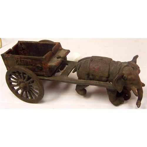 THIS IS A WONDERFUL OLD CAST IRON CIRCUS WAGON. IT HAS THE NAME CAIRO ON THE TWO SIDES. IT HAS A HINT OF ORANGE PAINT ON THE WAGON AND THE LAP COVER ON THE ELEPHANT HAS A HINT OF RED. IT IS VERY STURDY AND WAS MOST LIKELY PLAYED WITH ALOT IN IT'S DAY. IT HAS A ROLLER IN BETWEEN THE ELEPHANT'S FEET. THIS IS A NICE OLD TOY YOU IRON TOY COLLECTOR'S CHECK THIS OUT!!!
