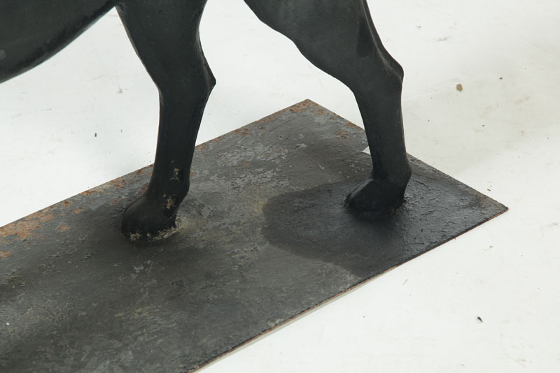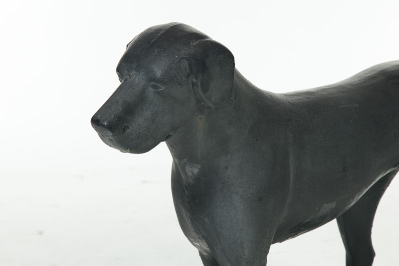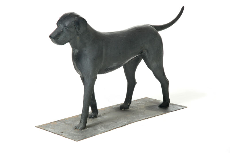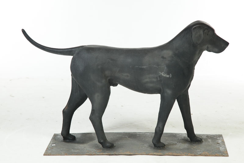 American, mid-19th century. Hunting dog with very good detail and old black repaint. Tail may have old soldered repair. Rectangular base. 29 1/2"h. 48"l.