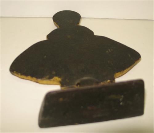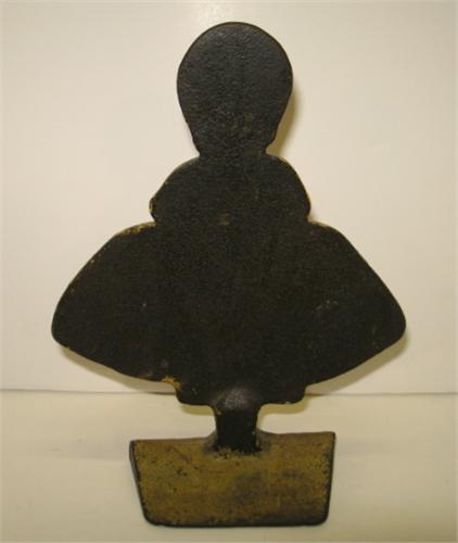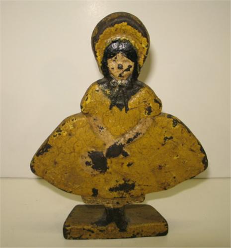 CAST IRON FIRGURAL DOOR STOP. Depicts young lady in yellow dress and bonnet. Shows severe loss to paint. 8.25” H