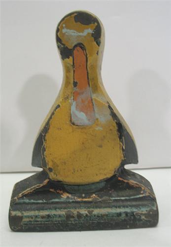 CAST IRON FIGURAL DOOR STOP. Depicts yellow duck. Shows severe loss to paint. 5” H